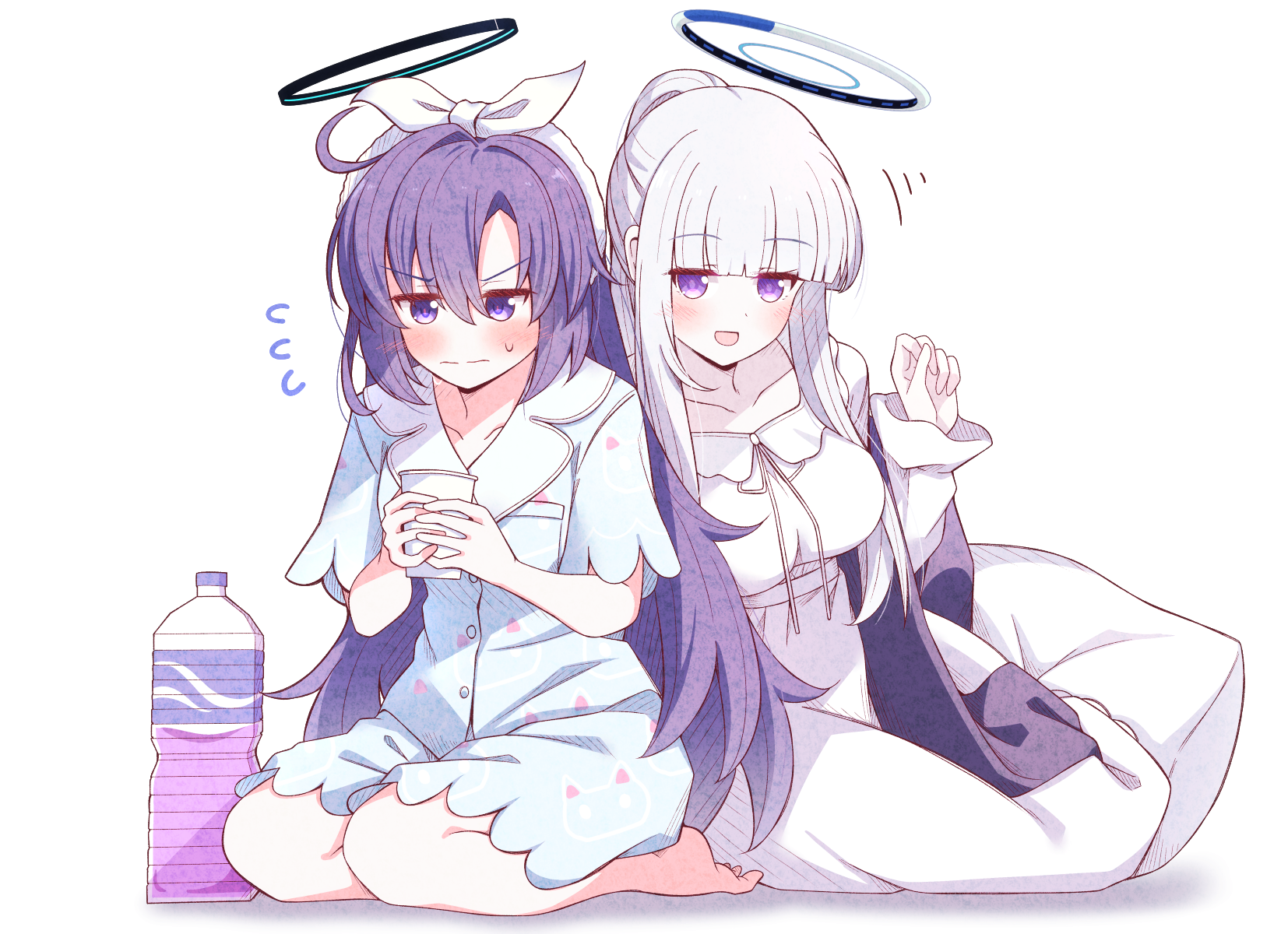 2girls barefoot black_halo blue_archive blue_shirt blush breast_press breasts closed_mouth collarbone commentary cup dress english_commentary feet hair_between_eyes halo highres holding holding_cup karikura_(atatata71) large_breasts legs long_hair looking_at_another looking_at_viewer mechanical_halo medium_breasts multiple_girls nail_polish noa_(blue_archive) noa_(pajamas)_(blue_archive) nose_blush purple_eyes purple_hair shirt short_sleeves simple_background smile white_background white_dress white_hair white_halo yuri yuuka_(blue_archive) yuuka_(pajamas)_(blue_archive)