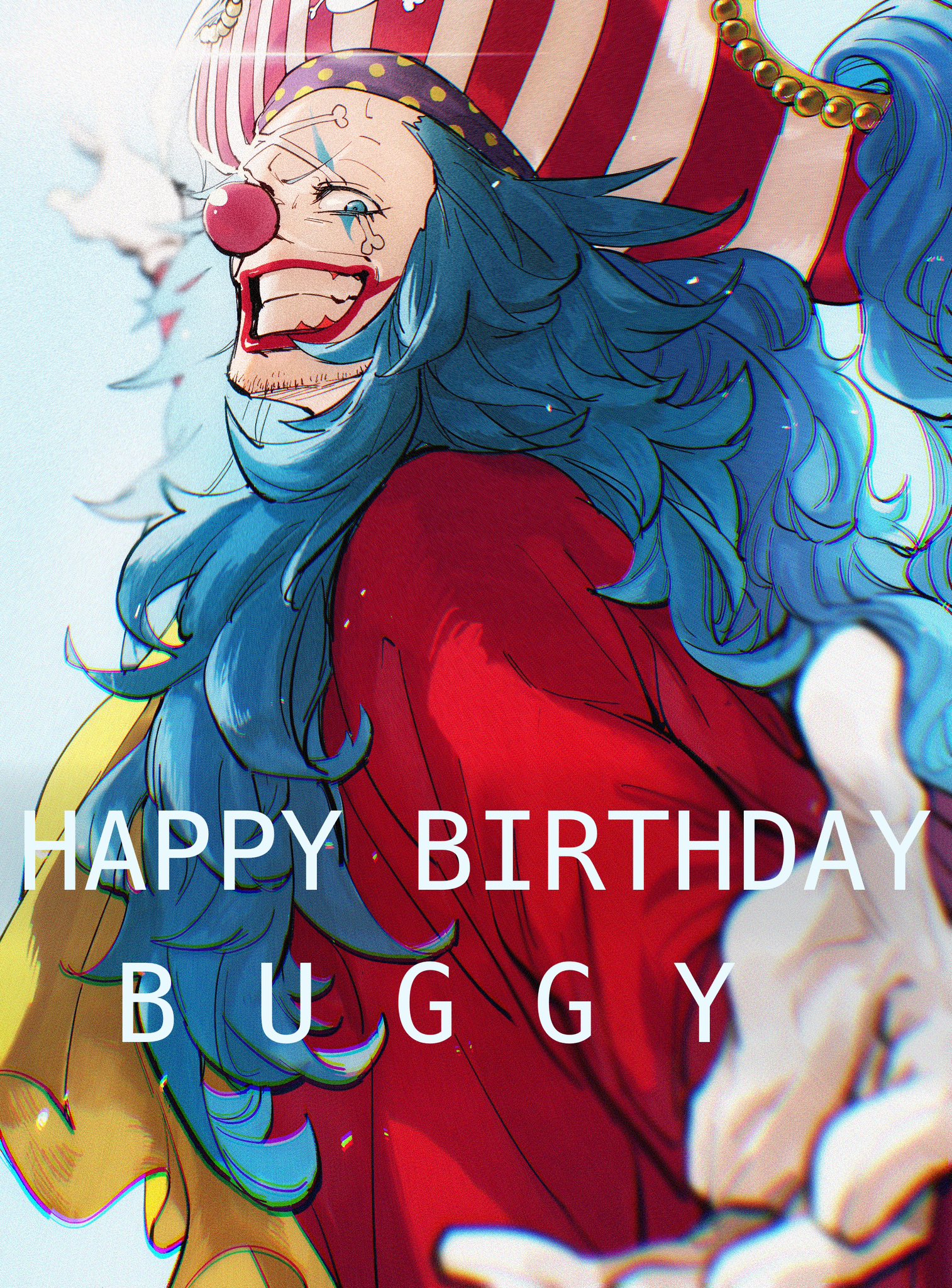 1boy abunaideka arm_up artist_name ascot beard_stubble blue_eyes blue_hair buggy_the_clown clenched_teeth commentary_request facial_hair gloves happy_birthday hat highres long_hair makeup male_focus one_piece pirate_hat pointing profile red_lips red_nose smile solo stubble teeth white_gloves yellow_ascot