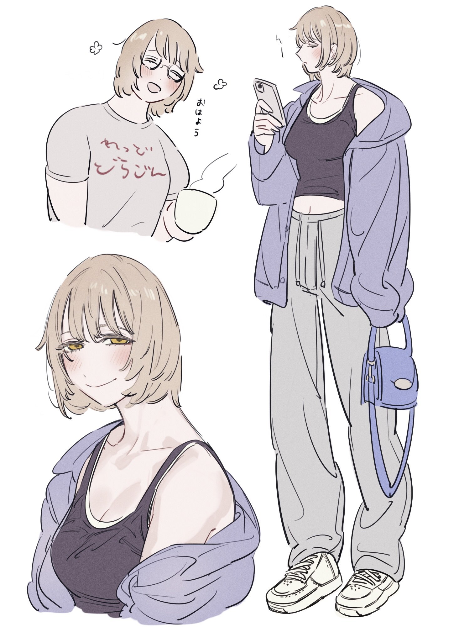 1girl bag black_tank_top blonde_hair blue_bag blue_jacket blush casual commentary_request dungeon_meshi falin_touden falin_touden_(tallman) glasses highres holding holding_phone jacket midriff_peek nahnohk navel pants phone short_hair smile sweatpants tall_female tank_top white_background yellow_eyes