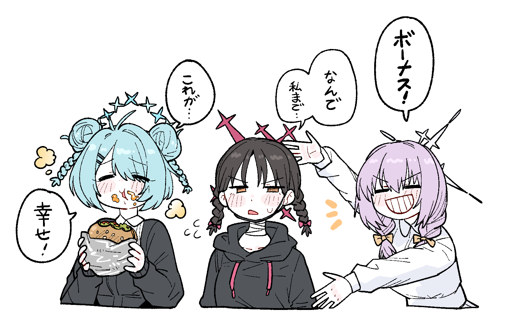 3girls =_= alternate_hairstyle aqua_hair atsuko's_grin_(meme) atsuko_(blue_archive) black_hair black_hoodie blue_archive blue_hair blue_halo blush_stickers braid burger commentary cropped_torso double_bun drawstring eating flying_sweatdrops food food_on_face food_wrapper grin hair_bun halo highres hiyori_(blue_archive) holding holding_burger holding_food hood hoodie long_sleeves meme misaki_(blue_archive) multiple_girls notice_lines orange_eyes pink_hair red_halo short_hair simple_background smile speech_bubble sweatdrop translated twin_braids upper_body v-shaped_eyebrows white_background white_halo wujurana