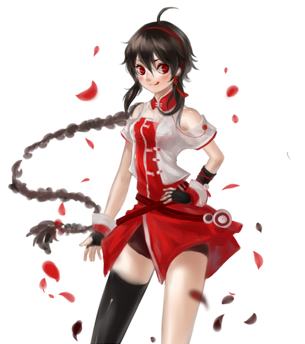 1girl ahoge bare_shoulders black_gloves black_shorts black_socks braid brown_hair collar commentary_request fingerless_gloves gloves headphones jacket long_hair red_collar red_eyes red_shirt red_theme shirt shorts single_braid single_sock smile socks solo thighhighs tongue tongue_out tuzhate vocaloid vsinger_(vocaloid) white_jacket yuezheng_ling yuezheng_ling_(vocaloid3)