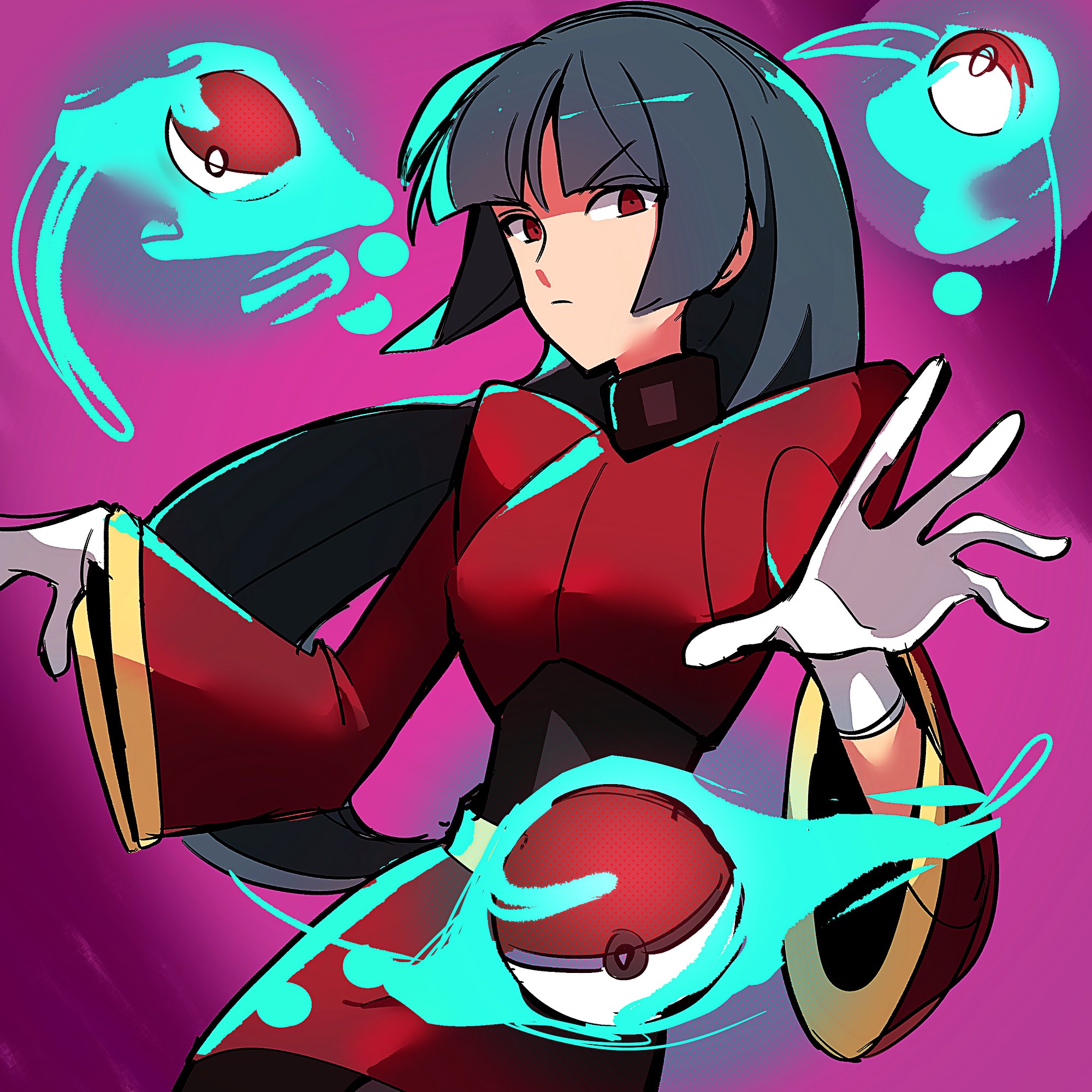 1girl blunt_bangs bodysuit bodysuit_under_clothes breasts commentary cozy_august cropped_jacket english_commentary floating floating_object gloves highres hime_cut jacket long_hair long_sleeves medium_breasts nintendo pencil_skirt poke_ball poke_ball_(basic) pokemon pokemon_red/green/blue/yellow red_eyes red_jacket red_skirt sabrina_(pokemon) side_slit skirt solo straight_hair telekinesis white_gloves