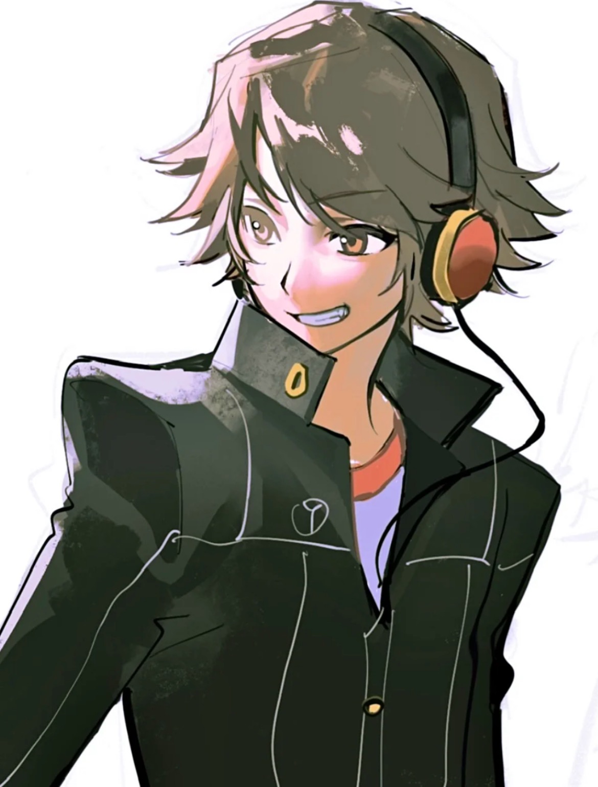 1boy black_jacket blue_shirt brown_hair chinese_commentary commentary_request fang grin hanamura_yousuke headphones highres jacket long_sleeves male_focus mojun682 orange_eyes persona persona_4 red_trim shirt short_hair simple_background smile solo tsurime upper_body white_background
