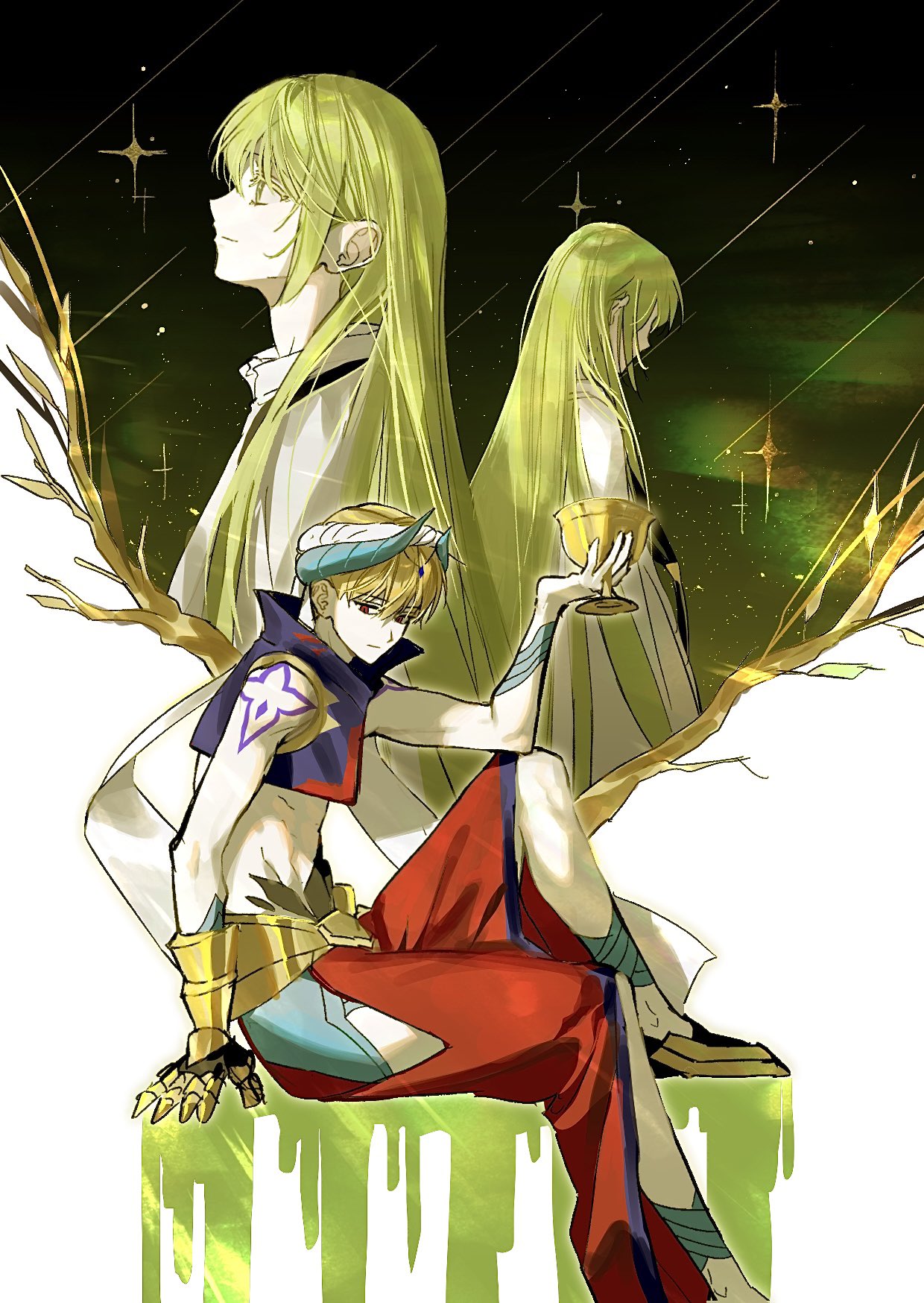 1other 2boys androgynous armor bare_shoulders black_shoes blonde_hair bloom branch circlet commentary_request cup dual_persona enkidu_(fate) fate/grand_order fate_(series) faulds feet_out_of_frame flower_tattoo from_behind from_side gauntlets gem gilgamesh gilgamesh_(caster)_(fate) gilgamesh_(fate) gold_armor green_eyes green_hair hair_between_eyes half-closed_eyes hand_up highres holding holding_cup holy_grail_(fate) hooded_robe kingu_(fate) korean_commentary lamyeongood leaf long_hair looking_at_viewer looking_up male_focus multiple_boys open_clothes open_vest other_focus pants purple_vest red_eyes red_gem red_pants robe shoes short_hair shoulder_tattoo single_gauntlet sitting smile sparkle tattoo turban upper_body very_long_hair vest white_robe white_turban wide_sleeves