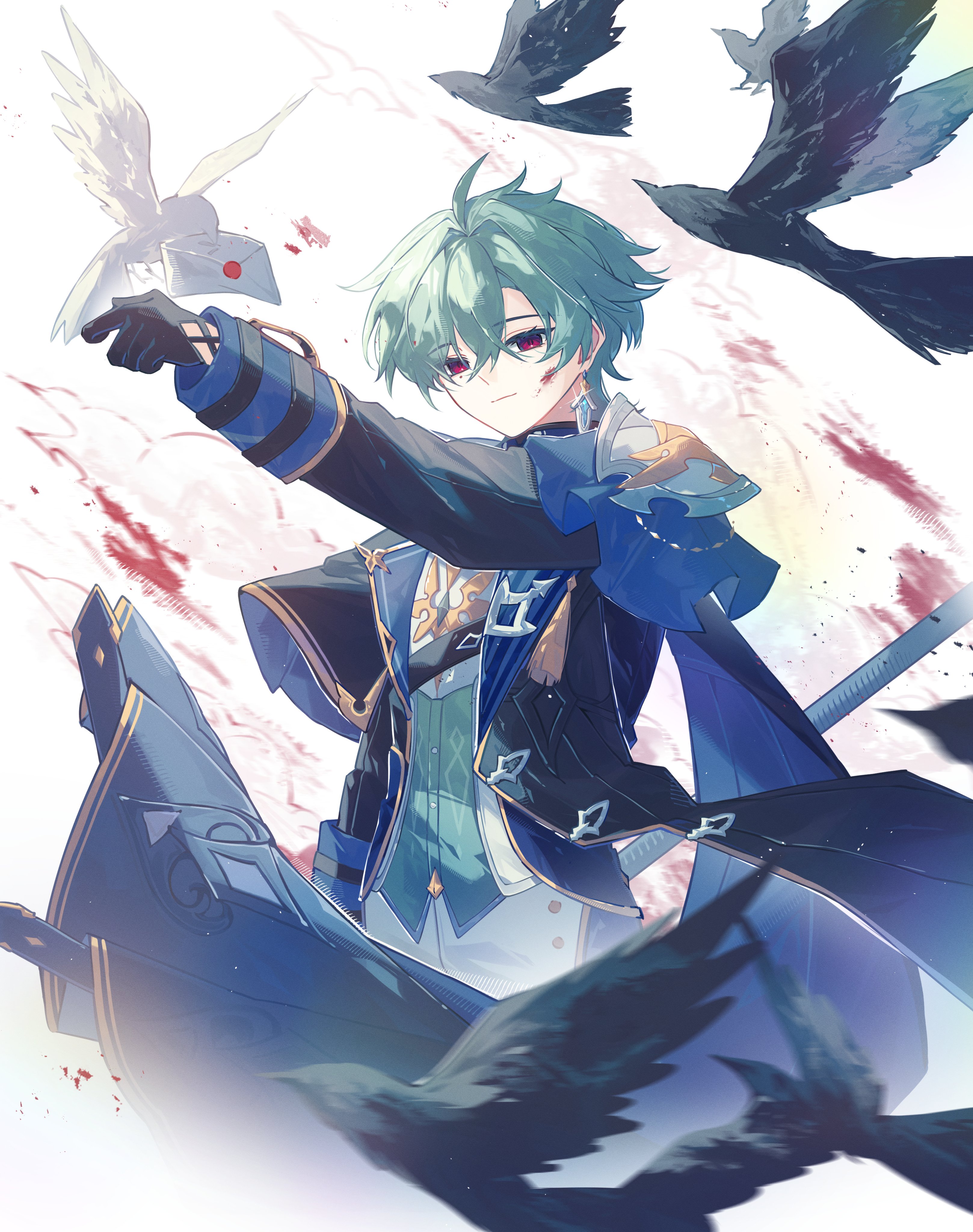 1boy absurdres ahoge aqua_eyes aqua_hair aqua_vest arm_up armor bird black_cape black_choker black_coat black_gloves blood blood_on_face blood_splatter blue_cape blue_coat blue_shirt cape choker closed_mouth coat collared_shirt commentary crossed_bangs earrings english_commentary envelope flock flying genshin_impact glint gloves gold_trim hair_between_eyes hair_intakes highres holding holding_polearm holding_weapon jewelry lapels letter lohen_(genshin_impact) long_sleeves looking_at_viewer makisa_(wim) male_focus mole mole_under_eye motion_blur multicolored_eyes open_clothes open_coat outstretched_arm pants pauldrons polearm red_eyes shirt short_hair shoulder_armor single_earring single_pauldron sleeve_cuffs smile solo tassel two-sided_cape two-sided_fabric vest weapon white_background white_pants white_shirt wing_collar