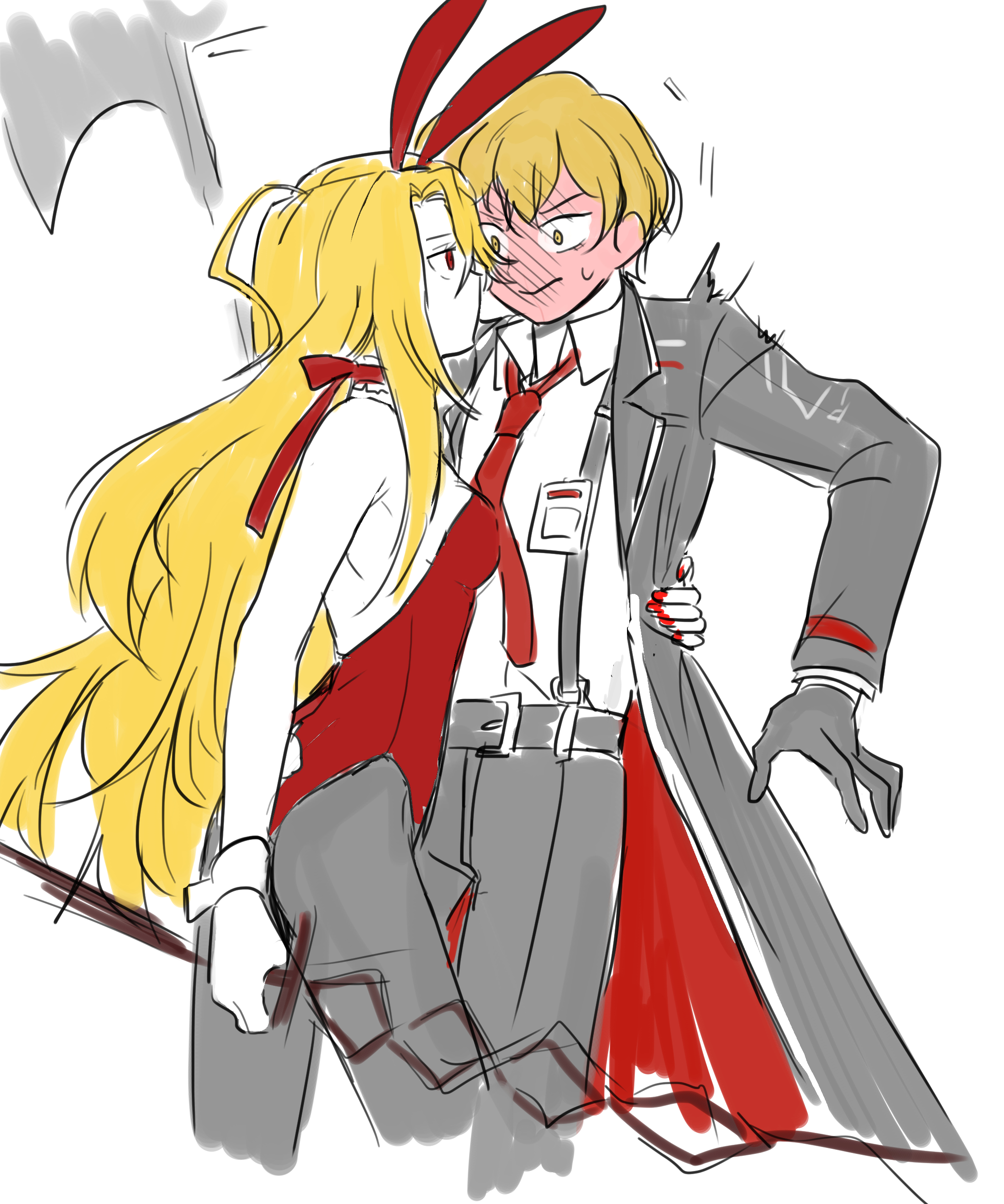 1boy 1girl absurdres animal_ears bare_shoulders black_coat black_gloves blonde_hair blush bow breasts coat collared_shirt commentary detached_collar don_quixote_(project_moon) fake_animal_ears gloves highres holding holding_weapon jacket la_manchaland_(identity)_(project_moon) lance leotard long_hair long_sleeves necktie nugii pants pantyhose parted_bangs playboy_bunny polearm rabbit_ears rabbit_tail red_eyes red_necktie sancho_(project_moon) shirt short_hair sinclair_(project_moon) strapless strapless_leotard tail untranslatable_commentary weapon white_shirt wrist_cuffs yellow_eyes