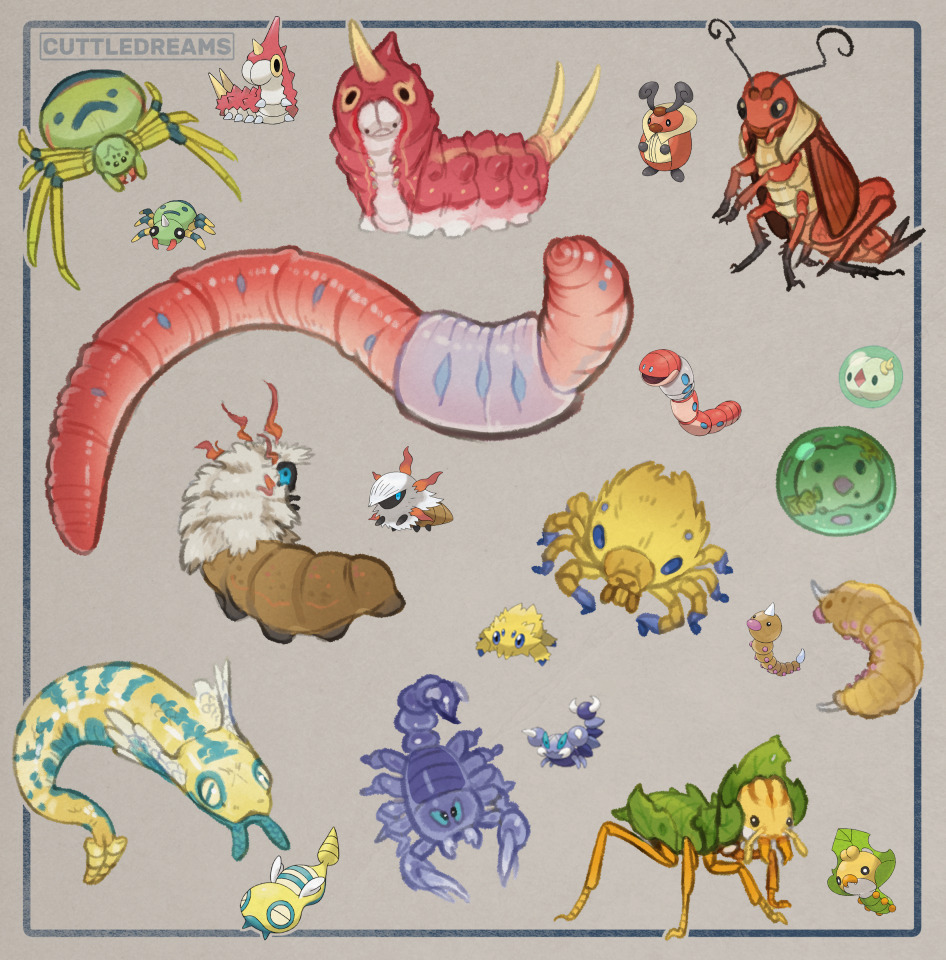 bug caterpillar cricket cuttledreams-bugs dunsparce earthworm gen_2_pokemon gen_3_pokemon gen_4_pokemon gen_5_pokemon joltik kricketot larva larvesta nintendo orthworm pokemon pokemon_(creature) scorpion sewaddle skorupi solosis species_connection spider spinarak worm wurmple