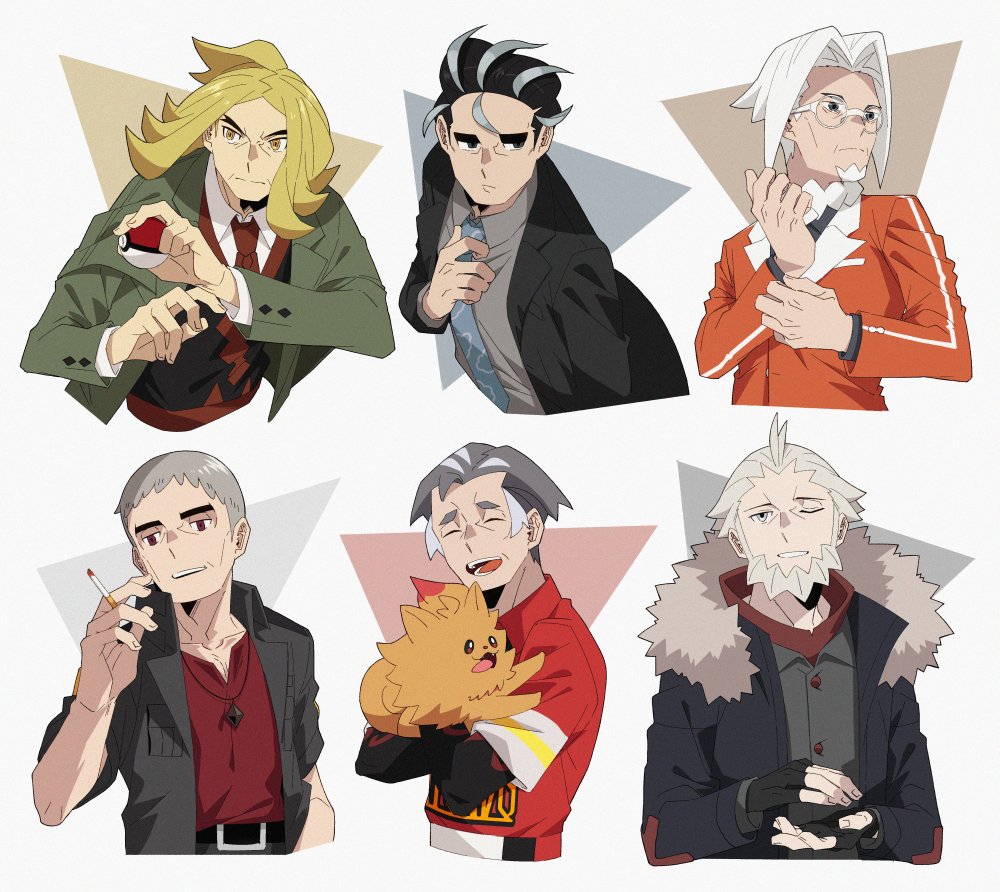 6+boys adjusting_clothes adjusting_necktie arm_up beard belt black_belt black_coat black_hair black_jacket black_shirt blonde_hair blue_necktie brown_eyes buttoned_cuffs buttons cigarette clavell_(pokemon) closed_eyes closed_mouth coat collarbone collared_shirt commentary_request cropped_torso facial_hair fur-trimmed_hood fur_trim glasses gloves goatee green_jacket grey_eyes grey_hair grey_shirt hair_slicked_back hassel_(pokemon) holding holding_cigarette holding_poke_ball holding_pokemon hood jacket jewelry kabu_(pokemon) lapels larry_(pokemon) layered_sleeves long_hair long_sleeves looking_to_the_side lysandre_(pokemon) male_focus mature_male multicolored_hair multiple_boys nanu_(pokemon) necklace necktie nintendo notched_lapels one_eye_closed open_mouth parted_hair partially_fingerless_gloves poke_ball poke_ball_(basic) pokemon pokemon_(creature) pokemon_legends:_z-a pokemon_sun_and_moon pokemon_scarlet_and_violet pokemon_sword_and_shield ponytail red_jacket red_shirt red_vest saikei shirt shirt_tucked_in short_over_long_sleeves short_sleeves sideways_glance smile streaked_hair thick_eyebrows vertical-striped_sleeves vest white-framed_eyewear white_background white_fur white_hair white_shirt wing_collar wrinkled_skin
