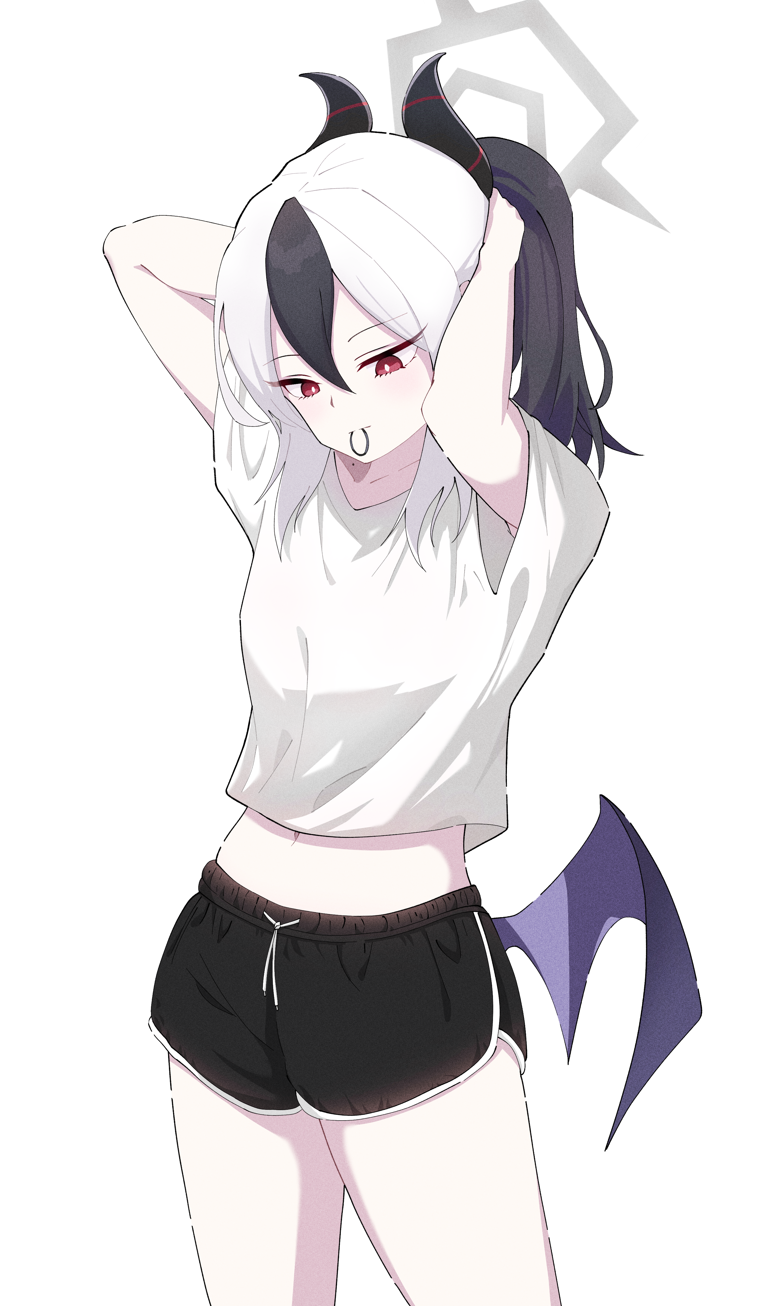 1girl absurdres black_hair blue_archive commentary grey_halo hair_tie hair_tie_in_mouth halo hand_in_own_hair highres hikkio kayoko_(blue_archive) looking_down mouth_hold ponytail shirt short_ponytail short_shorts shorts single_wing sports_panties t-shirt white_background white_hair wings