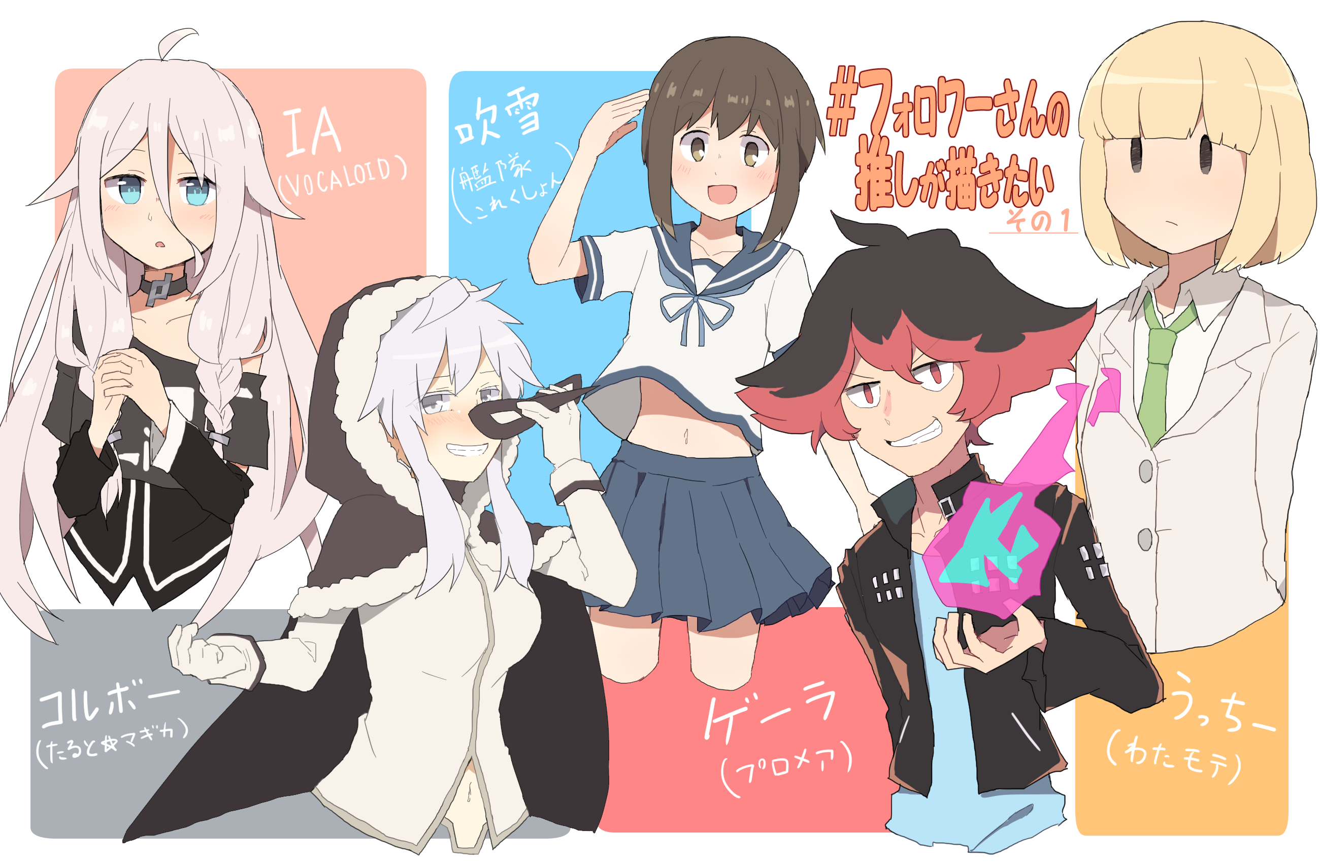 1boy 5girls :d age_difference ahoge arm_warmers black_hair black_jacket black_shirt blazer blonde_hair blue_background blue_eyes blue_neckerchief blue_sailor_collar blue_shirt blue_skirt blunt_bangs blush braid brown_capelet brown_eyes brown_hair capelet choker collared_shirt commentary_request corbeau_(madoka_magica) cowboy_shot double-parted_bangs frown fubuki_(kancolle) fur-trimmed_capelet fur-trimmed_hood fur_trim gloves green_necktie grey_background grey_eyes grey_hair grey_jacket grin gueira hair_between_eyes hair_flaps highres hood hooded_capelet ia_(vocaloid) jacket kantai_collection long_sleeves looking_at_viewer mahou_shoujo_madoka_magica mahou_shoujo_tart_magica midriff miniskirt multicolored_hair multiple_girls navel neckerchief necktie off-shoulder_shirt off_shoulder okudo61 open_clothes open_jacket open_mouth partially_translated pleated_skirt promare red_background red_eyes removing_mask sailor_collar salute shirt short_sleeves sidelocks simple_background skirt smile standing teeth translation_request two-tone_hair uchi_emiri upper_body vocaloid watashi_ga_motenai_no_wa_dou_kangaetemo_omaera_ga_warui! white_background white_gloves wide-eyed wind wind_lift yellow_background