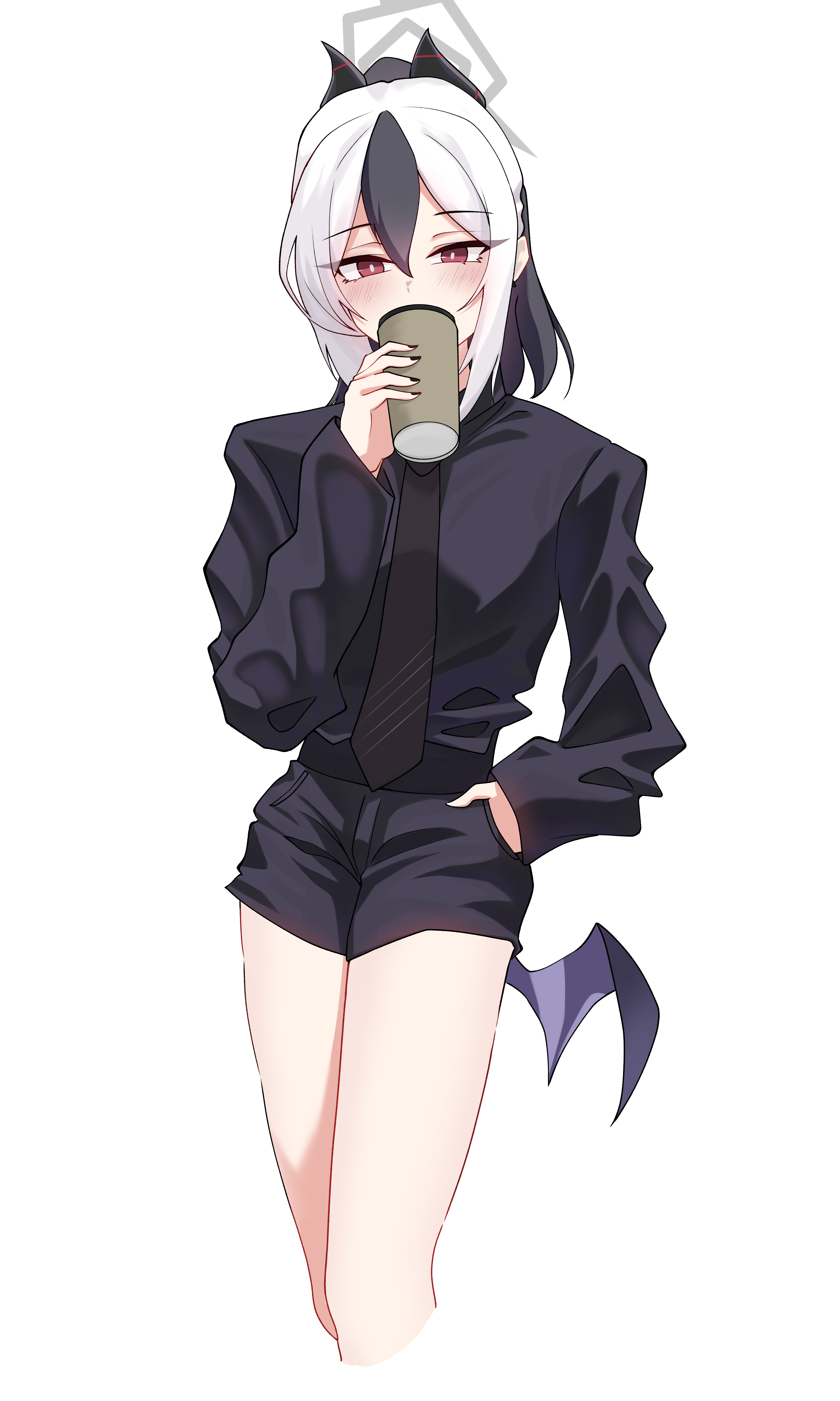 1girl absurdres black_horns black_suit blue_archive commentary cup demon_horns demon_wings formal_clothes grey_halo halo hand_in_pocket highres hikkio horns kayoko_(blue_archive) looking_at_viewer mug multicolored_hair short_shorts shorts simple_background single_wing solo suit two-tone_hair white_background white_hair wings