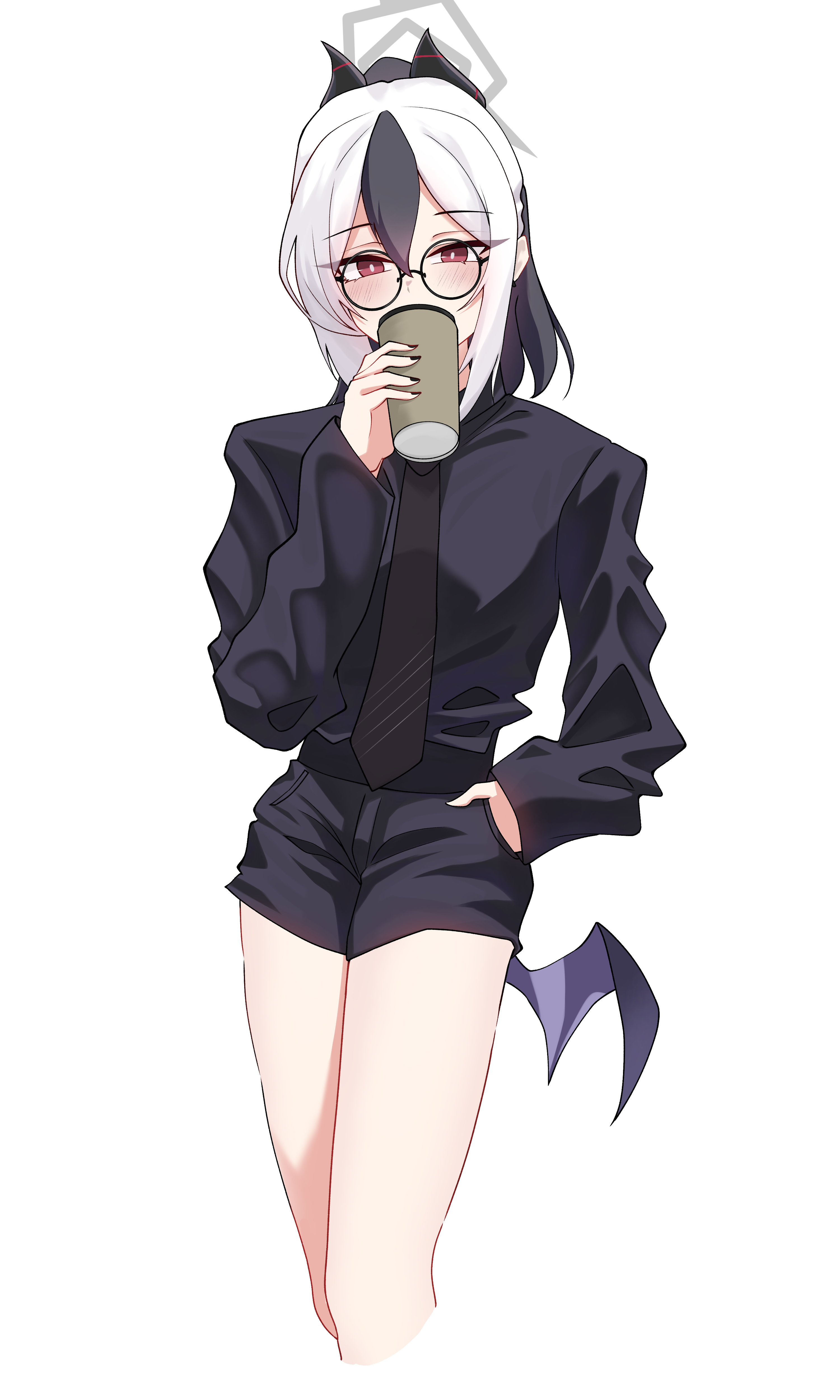 1girl absurdres black_horns black_suit blue_archive commentary cup demon_horns demon_wings formal_clothes glasses grey_halo halo hand_in_pocket highres hikkio horns kayoko_(blue_archive) looking_at_viewer mug multicolored_hair short_shorts shorts simple_background single_wing solo suit two-tone_hair white_background white_hair wings