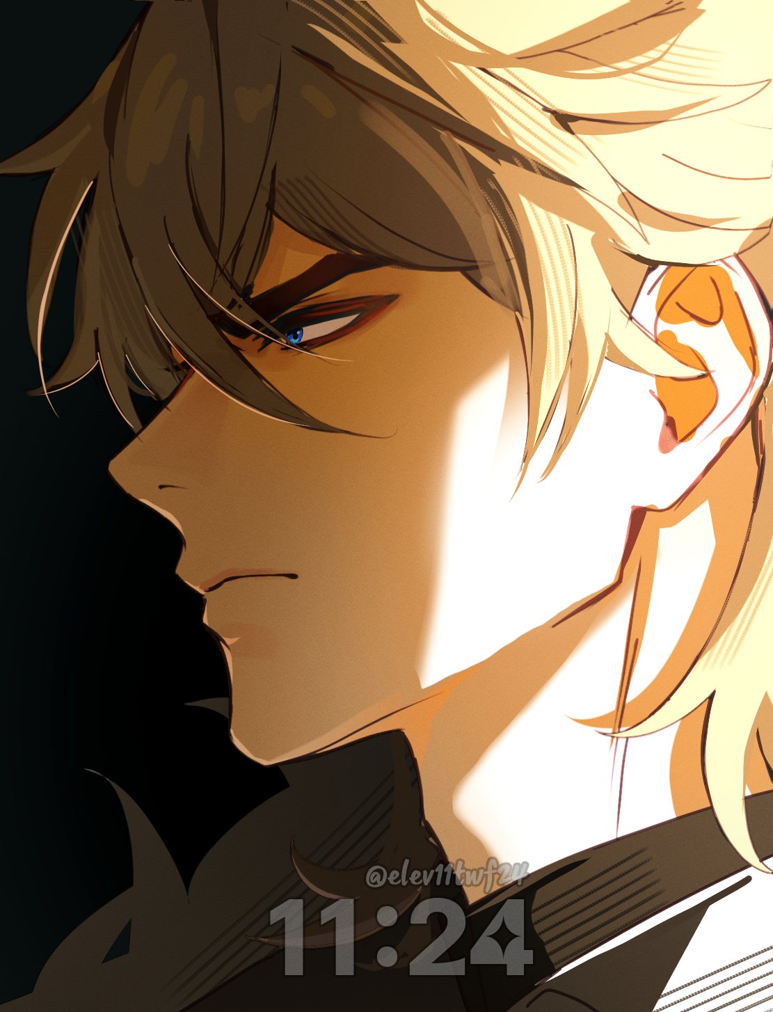 1boy black_background blonde_hair blue_eyes closed_mouth commentary_request elev11twf24 from_side frown genshin_impact highres male_focus portrait solo twitter_username varka_(genshin_impact)