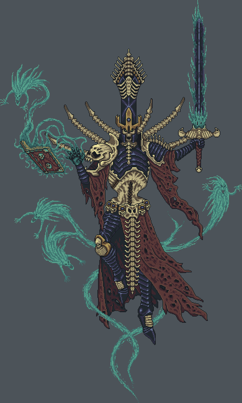 1boy armor black_armor black_helmet bone bone_armor book cape commentary emaciated energy english_commentary floating floating_book floating_object full_body ghost giant glowing glowing_eyes green_eyes grey_background helmet highres holding holding_sword holding_weapon horror_(theme) ismartal levitation lich male_focus nagash necromancer pixel_art skeleton skull solo stitched_torso stitches sword torn_cape torn_clothes undead waist_cape warhammer:_age_of_sigmar warhammer_fantasy weapon wind