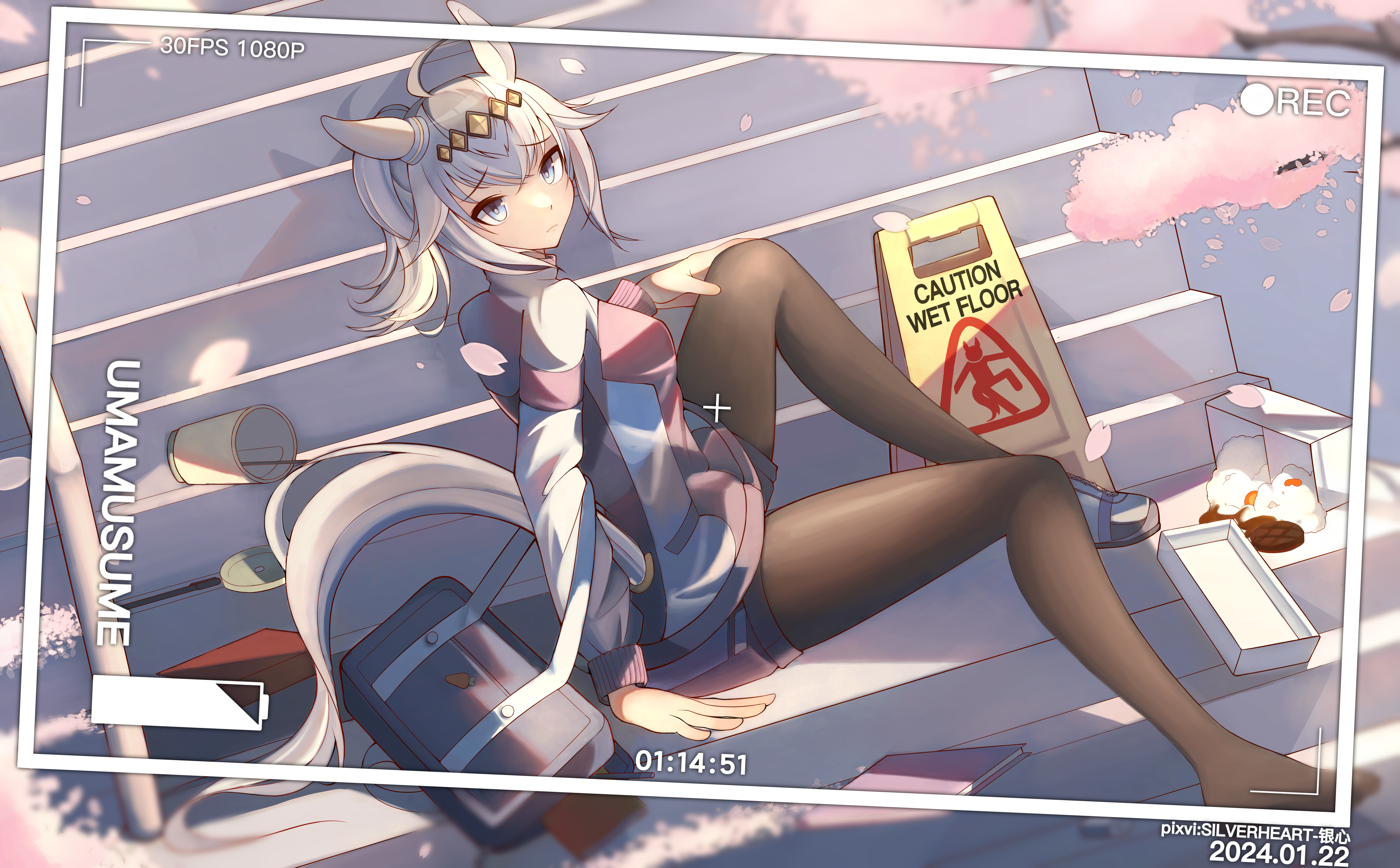 1girl absurdres ahoge animal_ears arm_support bag battery_indicator black_pantyhose blue_eyes breasts cherry_blossoms closed_mouth commentary_request cup disposable_cup ear_ornament food grey_hair grey_tail hair_between_eyes hair_ornament hairband highres horse_ears horse_girl horse_tail jacket kasamatsu_tracen_training_uniform long_hair long_sleeves medium_breasts multicolored_hair multicolored_jacket notebook oguri_cap_(umamusume) outdoors pantyhose pantyhose_under_shorts ponytail purple_jacket purple_shorts recording shorts shoulder_bag sitting sitting_on_stairs sliverheartawa solo spilled_drink stairs tail track_jacket umamusume umamusume:_cinderella_gray wet_floor_sign