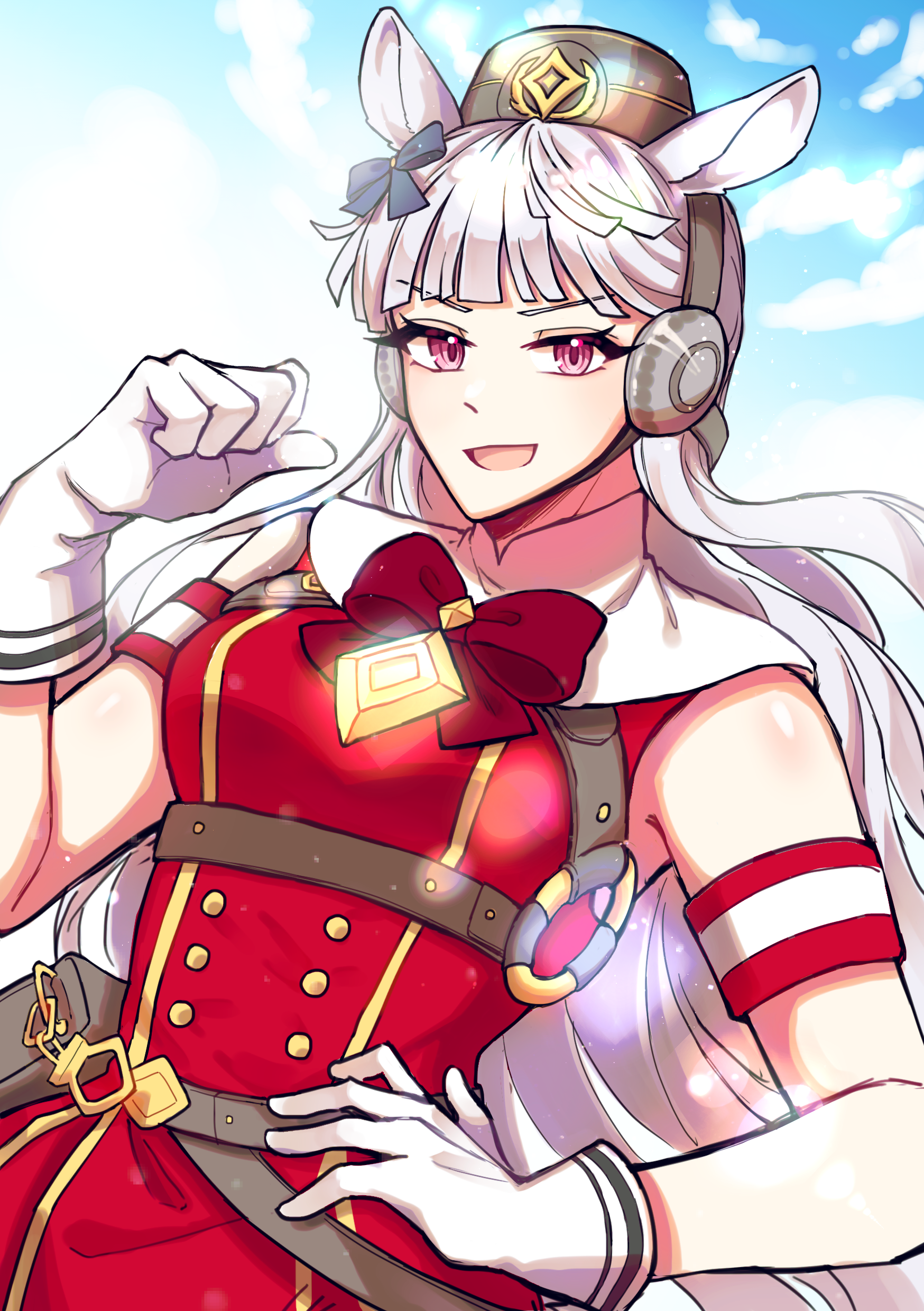 1girl absurdres animal_ears armband blue_sky blunt_bangs blush bow breasts brown_hat cloud commentary_request dress ear_bow ear_ribbon gloves gold_ship_(red_strife)_(umamusume) gold_ship_(umamusume) grey_hair hand_on_own_hip hat highres horse_ears horse_girl long_hair looking_at_viewer nenden_(user_ujdp8383) open_mouth pillbox_hat purple_eyes red_bow red_dress sky sleeveless sleeveless_dress smile solo striped_armband striped_clothes umamusume upper_body white_gloves