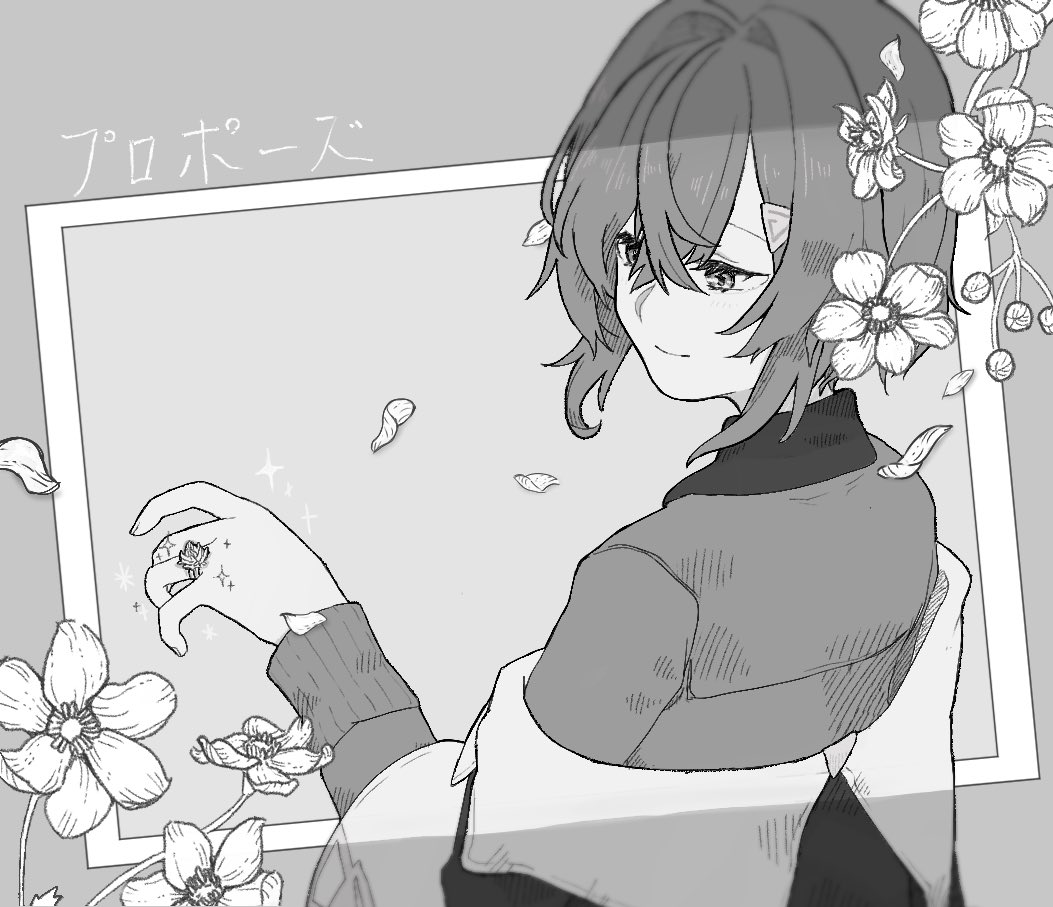 1girl ange_katrina ange_katrina_(1st_costume) cardigan closed_mouth commentary_request copyright_name crossed_bangs falling_petals flower_request flower_ring from_behind greyscale hair_between_eyes hair_intakes hair_ornament hand_up hatching_(texture) linear_hatching long_sleeves medium_hair monochrome nijisanji petals propose_(natori) sain_lt40 smile sparkle triangle_hair_ornament turning_head upper_body virtual_youtuber
