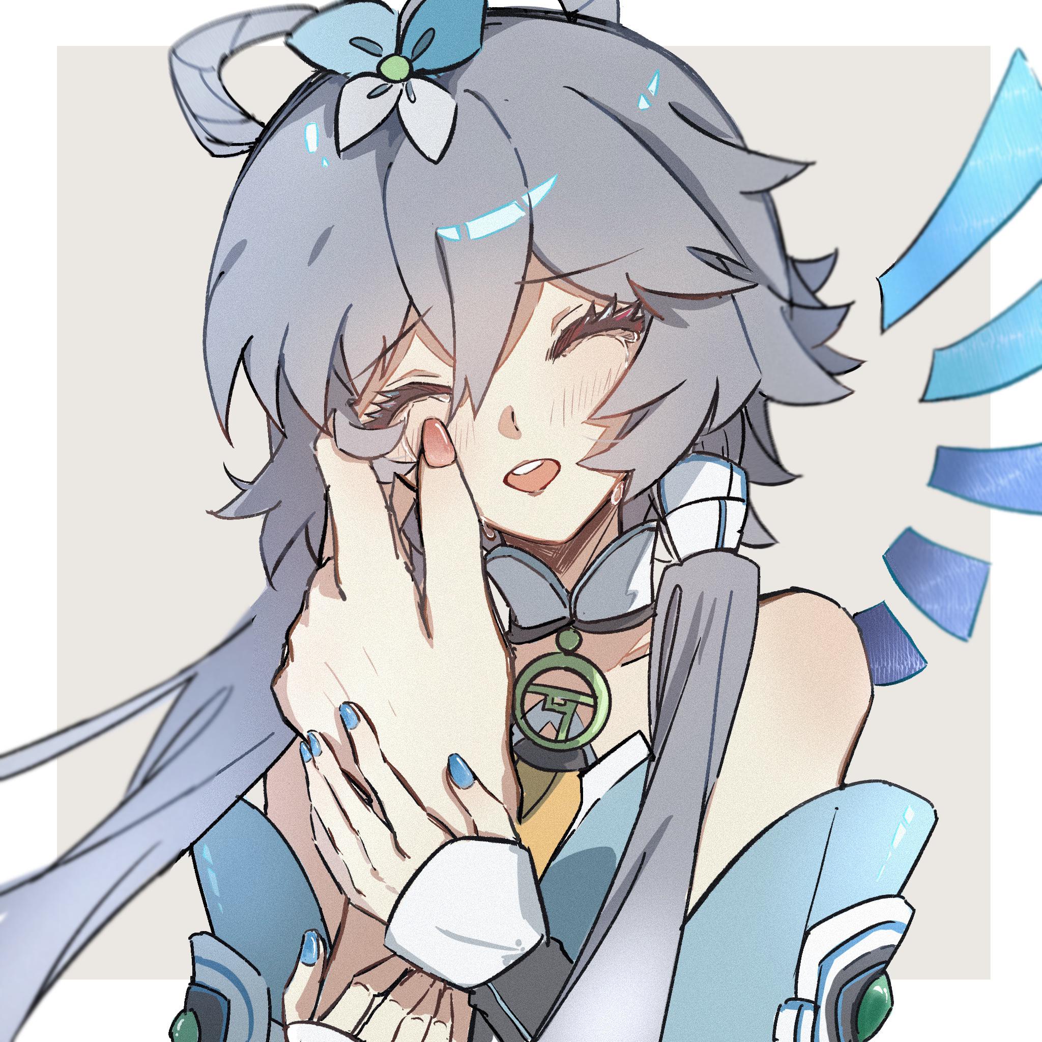 1girl bare_shoulders blue_shirt blue_sleeves closed_eyes collar commentary_request crying detached_sleeves feixianji_(hairstyle) fuurenri grey_hair hair_ornament hair_rings hand_on_another's_face highres holding holding_another's_arm long_hair luo_tianyi luo_tianyi_(vocaloid3) open_mouth shirt short_hair_with_long_locks single_wing smile solo tears vocaloid vsinger_(vocaloid) white_collar wings