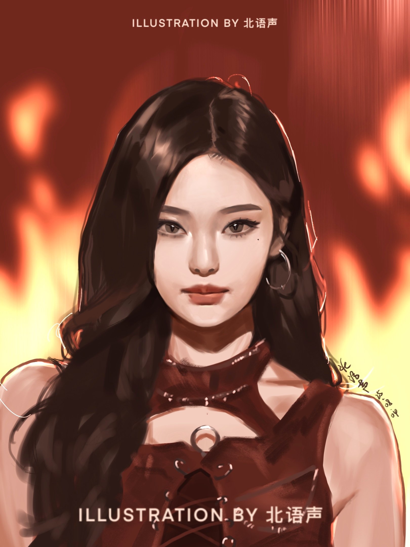 1girl aespa artist_name beiyusheng black_eyeliner brown_eyes brown_hair closed_mouth earrings eyeliner fire highres hoop_earrings jewelry k-pop looking_at_viewer makeup mole ningning_(aespa) real_life red_shirt shirt solo upper_body