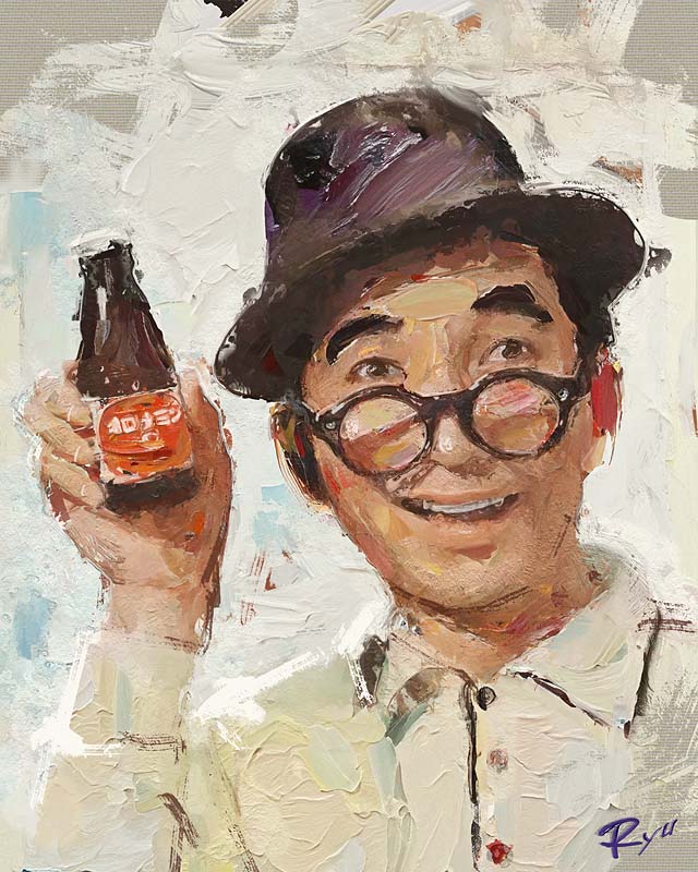 1boy artist_name black-framed_eyewear black_eyes black_hat bottle bucket_hat collared_shirt commentary_request east_asian grin hand_up hat holding holding_bottle male_focus oil_painting_(medium) oomura_kon painting_(medium) real_life realistic round_eyewear ryu_(ftyh2578) shirt smile traditional_media upper_body white_background white_shirt wing_collar
