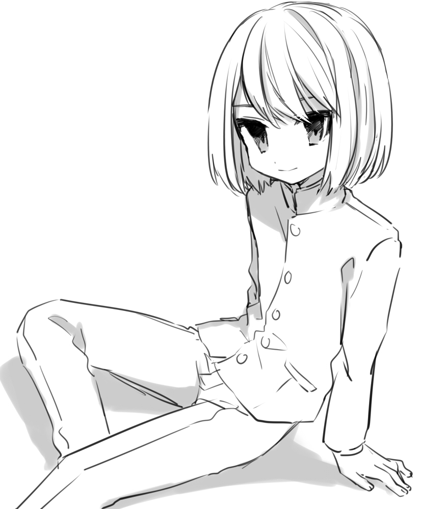 1other alternate_costume androgynous arm_support bob_cut buttons chara_(undertale) closed_mouth commentary_request dot_nose empty_eyes feet_out_of_frame gakuran greyscale high_collar leftporygon long_sleeves looking_at_viewer monochrome other_focus pants school_uniform short_hair simple_background sitting sketch smile solo swept_bangs undertale utdr_(toby_fox) white_background