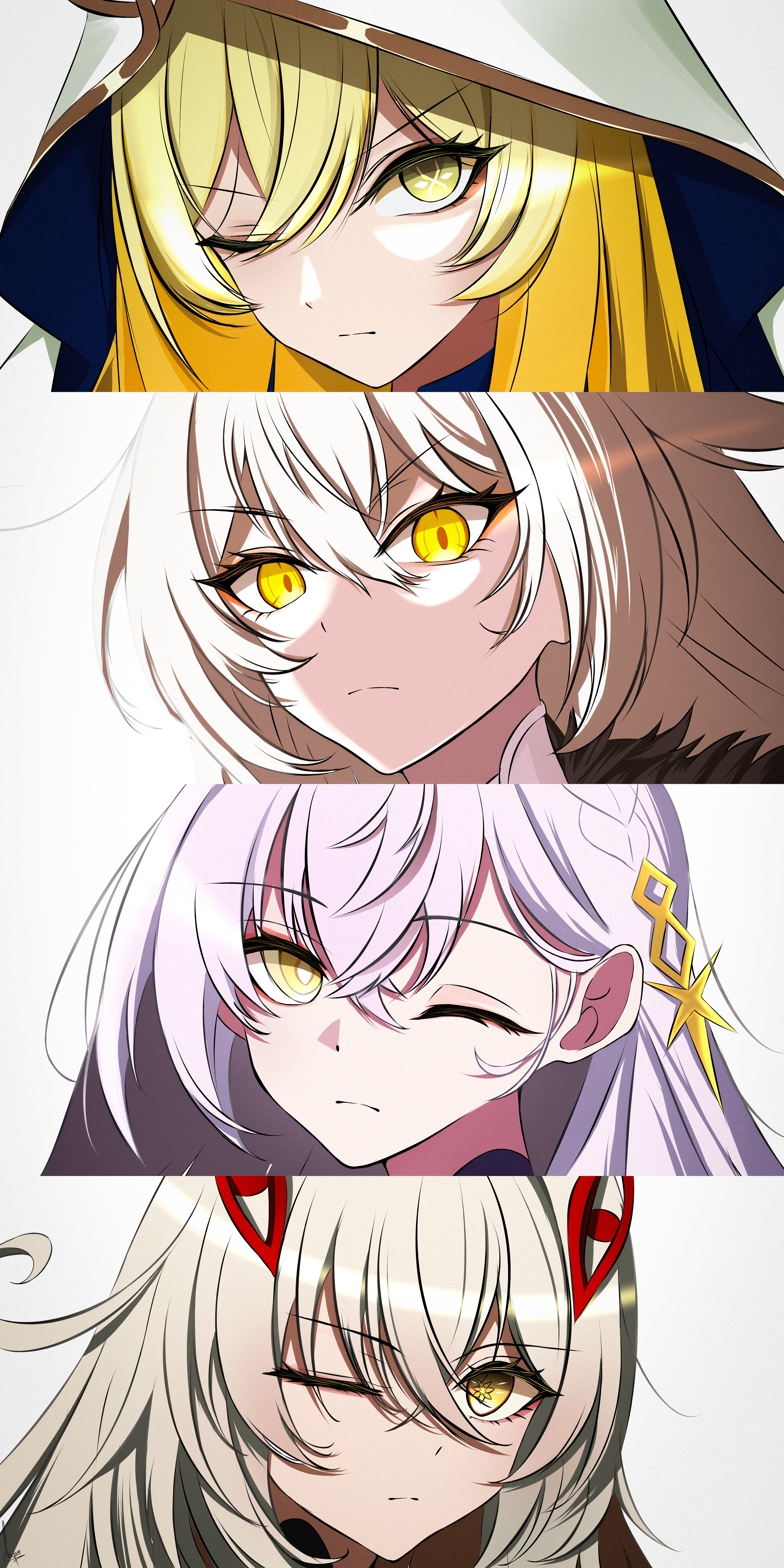 4girls absurdres abysssian angry asmoday_(genshin_impact) blonde_hair close-up closed_mouth commentary english_commentary expressionless eye_symbol fur_trim genshin_impact glowing glowing_eyes grey_hair hair_between_eyes hair_ornament highres hood hood_up istaroth_(genshin_impact) looking_at_viewer looking_to_the_side multicolored_hair multiple_girls one_eye_closed rhinedottir_(genshin_impact) ronova_(genshin_impact) shade side_ahoge star_(symbol) streaked_hair symbol-shaped_pupils upper_body veil white_hair yellow_background