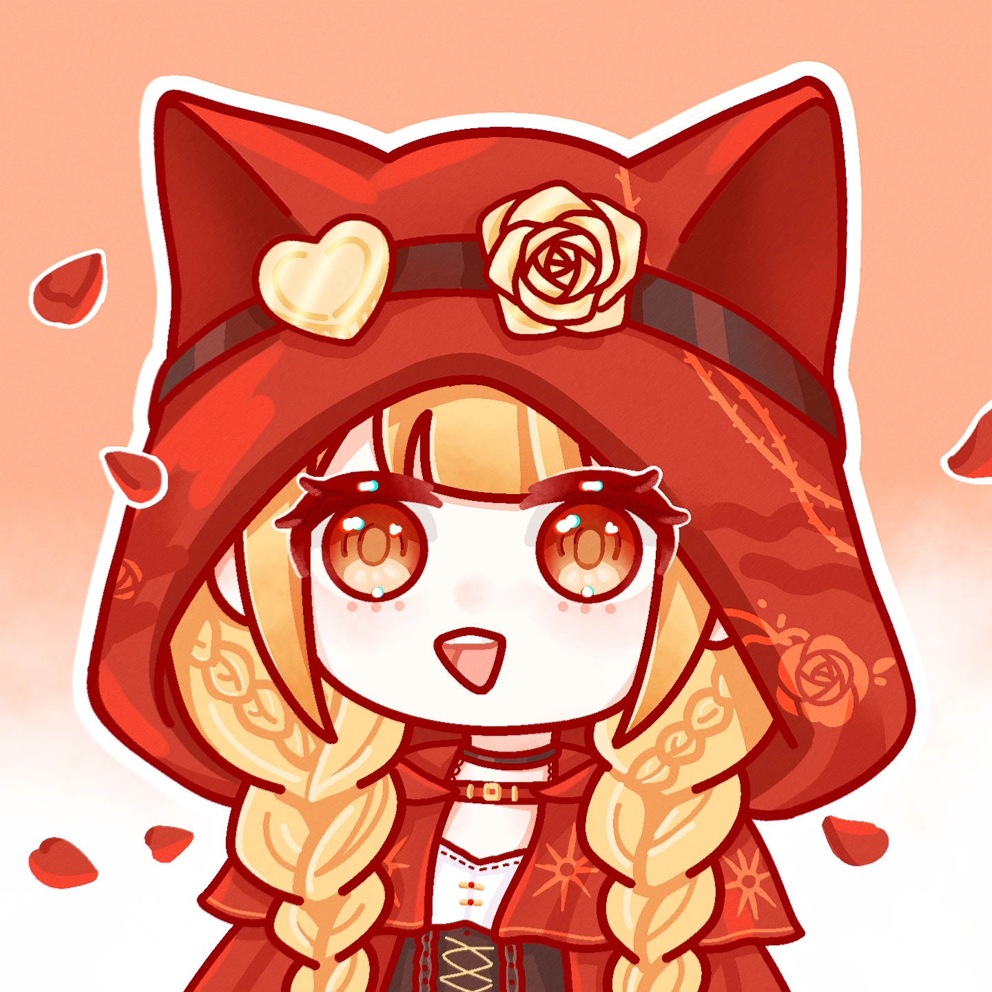 1girl animal_ear_hood animal_ears asymmetrical_eyewear belt belt_buckle black-framed_eyewear black_choker black_corset blonde_hair blunt_bangs braid brown_eyes buckle center_frills chibi chinese_commentary choker cloak commentary_request corset eyes_visible_through_hair fake_animal_ears floral_print flower flower-shaped_eyewear frills goggles goggles_on_headwear gold_buckle gradient_background hair_over_shoulder happy heart heart-shaped_eyewear heart_in_eye highres hood hood_up hooded_cloak infinity_nikki light_blush long_hair looking_at_viewer nikki_(series) open_mouth orange_background outline petals print_cloak red_belt red_cloak ribbon-trimmed_shirt ribbon_trim rose rose_petals rose_print she_is_wildfire_(infinity_nikki) shirt smile solo sun_print symbol_in_eye teeth thorns twin_braids two-tone_background upper_body upper_teeth_only very_long_hair white_background white_outline white_shirt wolf_ears xinyuejiang382 yellow_flower yellow_rose