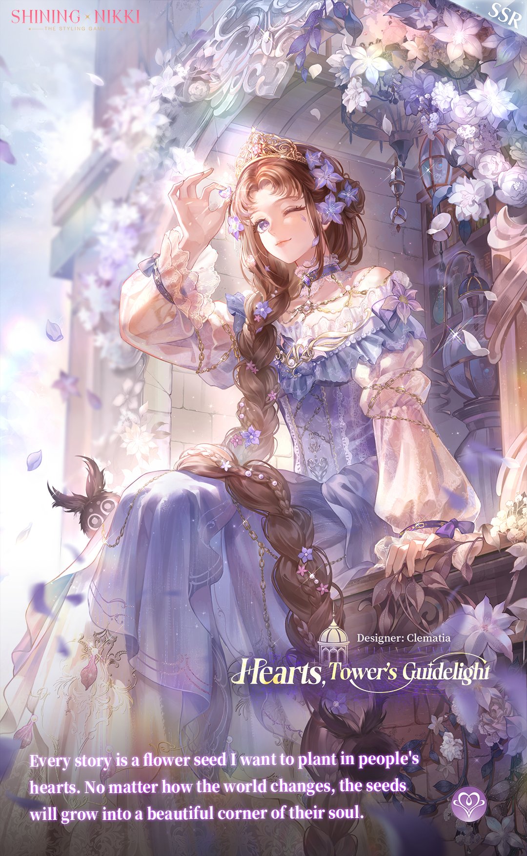 1girl absurdly_long_hair artist_request blue_sky bow braid brown_hair character_name choker clematia_(shining_nikki) closed_mouth cloud commentary copyright_logo diamond_(gemstone) dress english_commentary english_text eyelashes falling_petals feet_out_of_frame flower frilled_choker frilled_sleeves frills gem gold_tiara gown hair_bun hair_flower hair_ornament hair_over_shoulder happy hearts_tower's_guidelight_(shining_nikki) highres holding holding_gem juliet_sleeves layered_dress layered_sleeves light_particles lipstick logo long_hair long_sleeves looking_ahead makeup nikki_(series) off-shoulder_dress off_shoulder official_art on_windowsill one_eye_closed petals pink_flower pink_lips puffy_sleeves purple_bow purple_choker purple_dress purple_eyes purple_flower rainbow second-party_source shining_nikki short_over_long_sleeves short_sleeves single_braid single_side_bun sitting sky sleeve_bow sleeves_past_wrists smile solo tower very_long_hair white_dress