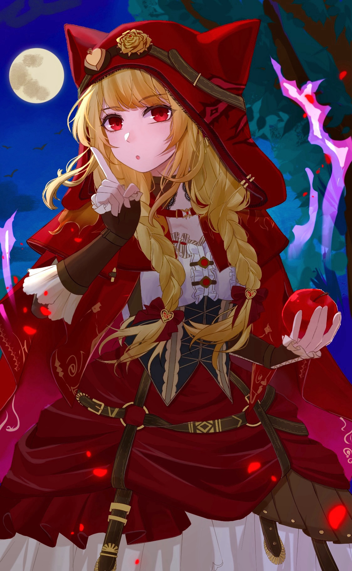 1girl :o animal_ear_hood animal_ears apple arm_warmers asymmetrical_eyewear belt belt_buckle black-framed_eyewear black_collar black_corset blonde_hair blue_sky bow braid brown_arm_warmers brown_belt buckle buttons center_frills chinese_commentary cloak cloud collar commentary_request corset cowboy_shot cross-laced_armwear detached_collar dot_nose eyelashes fake_animal_ears finger_to_cheek fire flock flower flower-shaped_eyewear food forest frilled_arm_warmers frilled_skirt frills fruit full_moon goggles goggles_on_headwear hair_bow hair_ornament hair_over_shoulder heart heart-shaped_eyewear heart_hair_ornament highres holding holding_food holding_fruit hood hood_up hooded_cloak infinity_nikki jiumo_(pixiv_32921912) layered_skirt little_red_riding_hood_(fairy_tale) little_red_riding_hood_(fairy_tale_character) long_hair long_skirt looking_at_viewer moon multiple_belts nature night nikki_(series) o-ring o-ring_belt open_mouth outdoors petals print_cloak purple_fire red_belt red_bow red_cloak red_eyes red_skirt rose rose_petals she_is_wildfire_(infinity_nikki) shirt simple_bird skirt sky solo standing thorns tree twin_braids very_long_hair white_shirt white_skirt wolf_ears yellow_flower yellow_rose