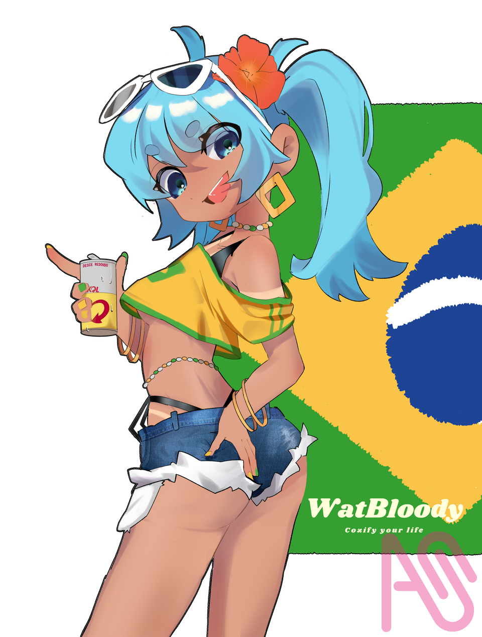 alternate_costume aqua_eyes aqua_hair bracelet brazilian_flag brazilian_miku can crop_top dark_skin denim denim_shorts earrings female_focus flower hair_flower hair_ornament hatsune_miku highres holding holding_can jeans_shorts jewelry nail_polish shorts simple_background smile solo solo_focus sunglasses tan tank_top thighs twintails vocaloid watblood white_background