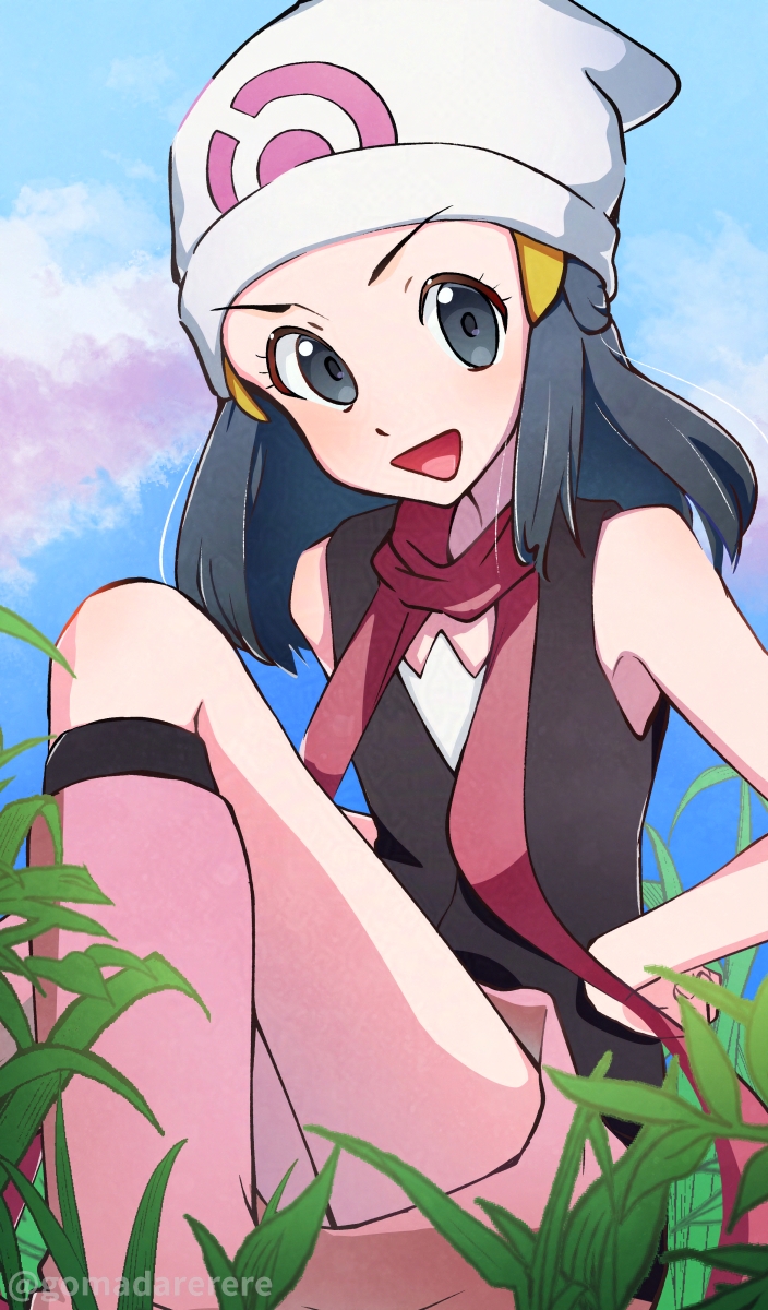 1girl :d beanie black_hair black_shirt black_socks boots cloud commentary_request dawn_(pokemon) day eyelashes gomadarerere grass grey_eyes hair_ornament hairclip hat highres kneehighs long_hair nintendo open_mouth outdoors pink_boots pink_skirt pokemon pokemon_diamond/pearl/platinum red_scarf scarf shirt sidelocks sitting skirt sky sleeveless sleeveless_shirt smile socks solo watermark white_hat