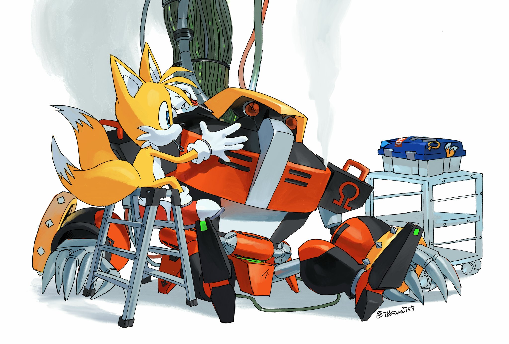 1boy animal_ears animal_nose artist_name assembling blue_eyes cable closed_mouth commentary_request crack cracked_glass crate damaged e-123_omega exposed_internal_machinery fox fox_boy fox_ears fox_tail furry furry_male gloves green_eyes highres holding holding_screwdriver ladder male_focus mecha multiple_tails repairing robot screwdriver shoes sitting sonic_(series) steaming_body stepladder stoo stool tail tails_(sonic) tokiwa757 tube twitter_username two_tails white_background white_gloves wire yellow_fur