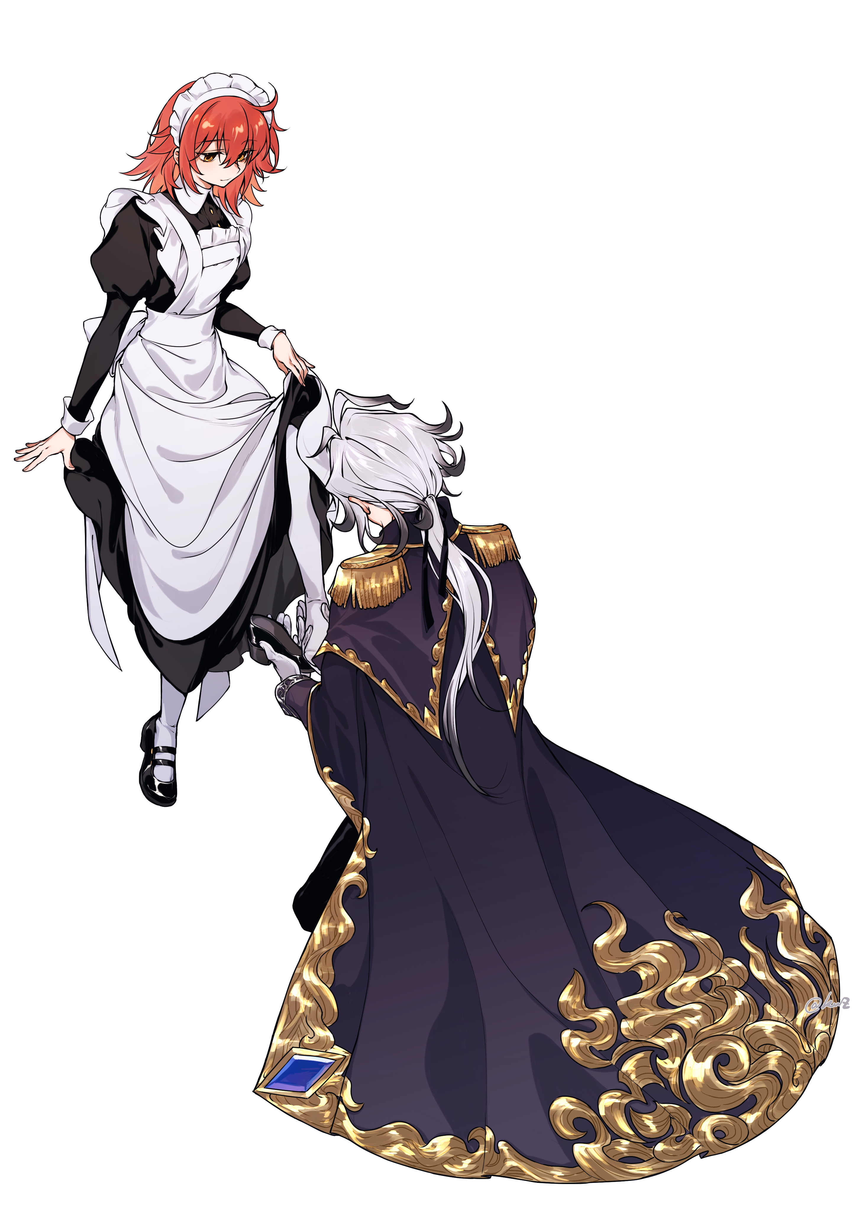 1boy 1girl absurdres ahoge apron black_dress coat dress dressing_another edmond_dantes_(fate) epaulettes fate/grand_order fate_(series) fujimaru_ritsuka_(female) gradient_hair grey_hair highres lix_118 long_hair long_sleeves low_ponytail maid maid_headdress medium_hair multicolored_hair orange_hair ponytail puffy_sleeves purple_coat putting_on_footwear the_count_of_monte_cristo_(fate) the_count_of_monte_cristo_(second_ascension)_(fate) white_apron white_hair
