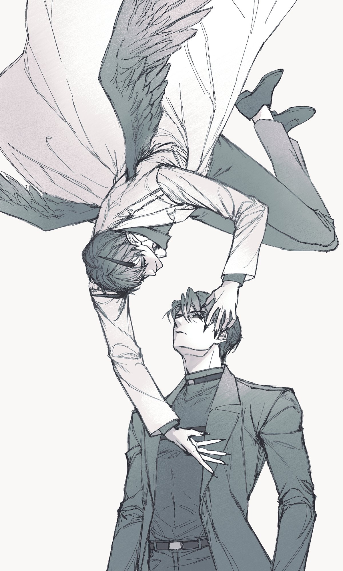2boys belt_collar coat collar commentary curtained_hair demon_horns demon_wings feathered_wings fingernails greyscale hand_on_another's_head highres horns house_go kim_dokja male_focus monochrome multiple_boys official_alternate_costume omniscient_reader's_viewpoint open_clothes open_coat outstretched_arm popped_collar reaching reaching_towards_another sharp_fingernails short_hair wings yoo_joonghyuk
