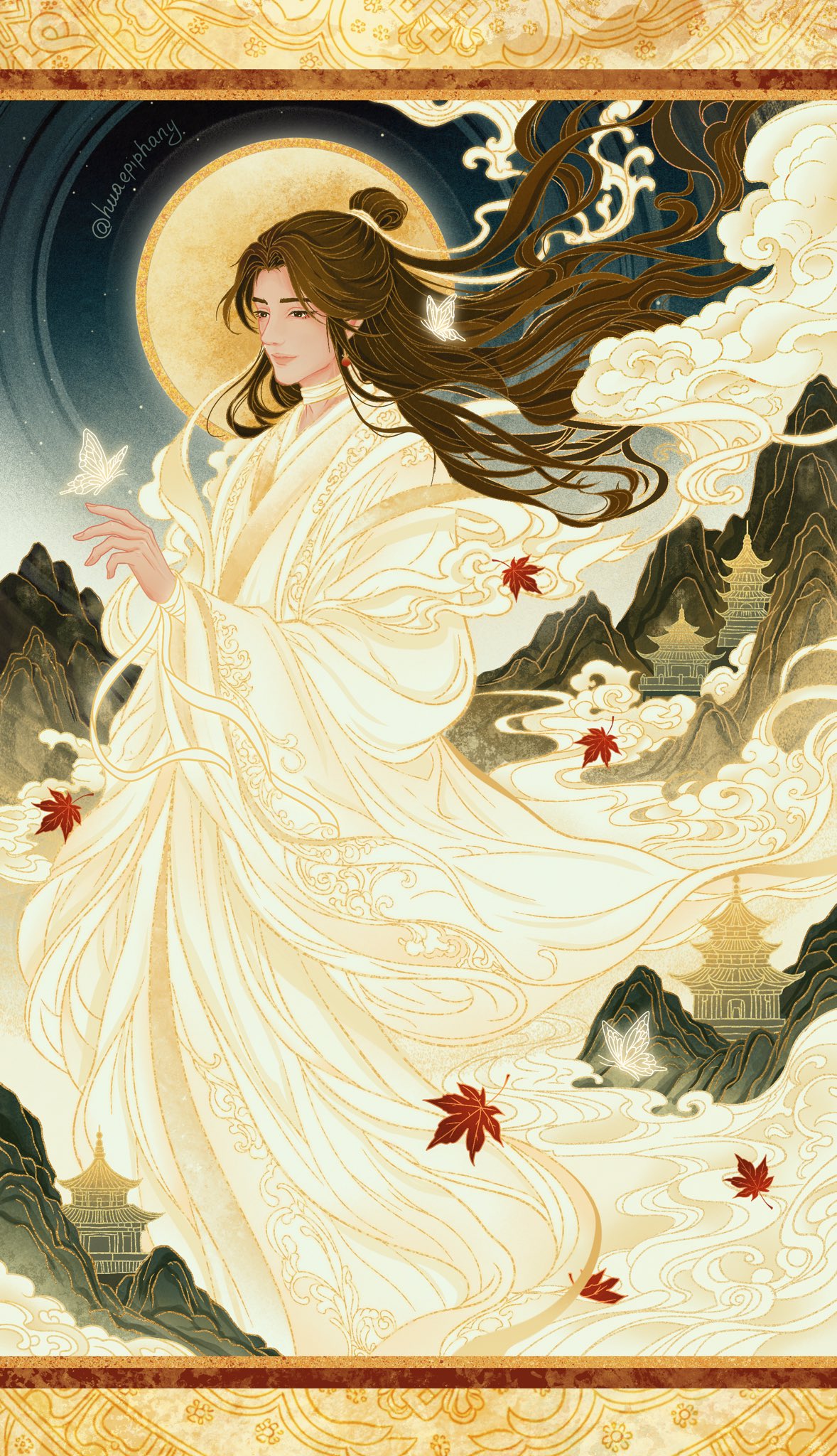 1boy architecture autumn_leaves bandaged_arm bandaged_neck bandages black_eyes border brown_border brown_hair bug butterfly butterfly_on_hand chinese_clothes closed_mouth cloud commentary_request curtained_hair east_asian_architecture falling_leaves full_moon glowing_butterfly gold gold_border gradient_sky hair_bun halo hanfu highres huaepiphany insect leaf letterboxed long_hair long_sleeves looking_at_animal male_focus maple_leaf moon mountain night ornate_border outdoors parted_bangs ribbon single_hair_bun sky smile solo tianguan_cifu white_butterfly white_hanfu white_ribbon wide_sleeves xie_lian