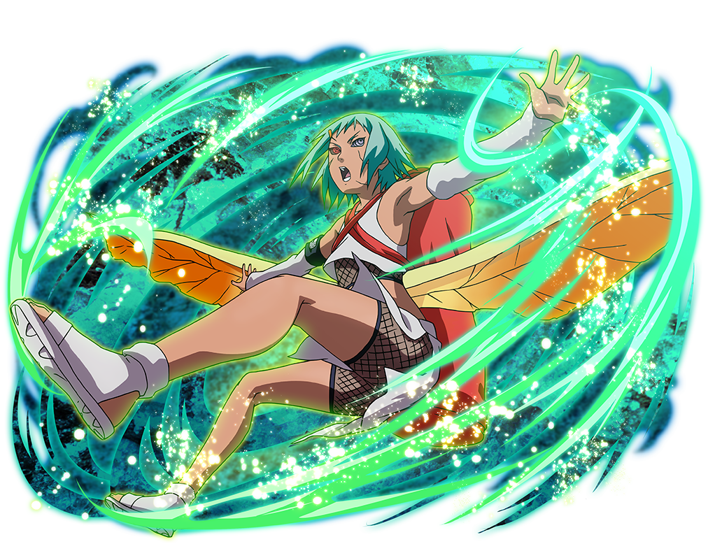 1girl aqua_hair black_sclera boots colored_sclera dark-skinned_female dark_skin detached_sleeves edo_tensei fishnet_shorts fuu_(naruto) heterochromia insect_wings naruto_(series) naruto_shippuuden naruto_shippuuden:_ultimate_ninja_blazing official_art open-toe_boots open_mouth purple_eyes red_eyes rinnegan sharingan solo teeth white_boots white_sleeves wings