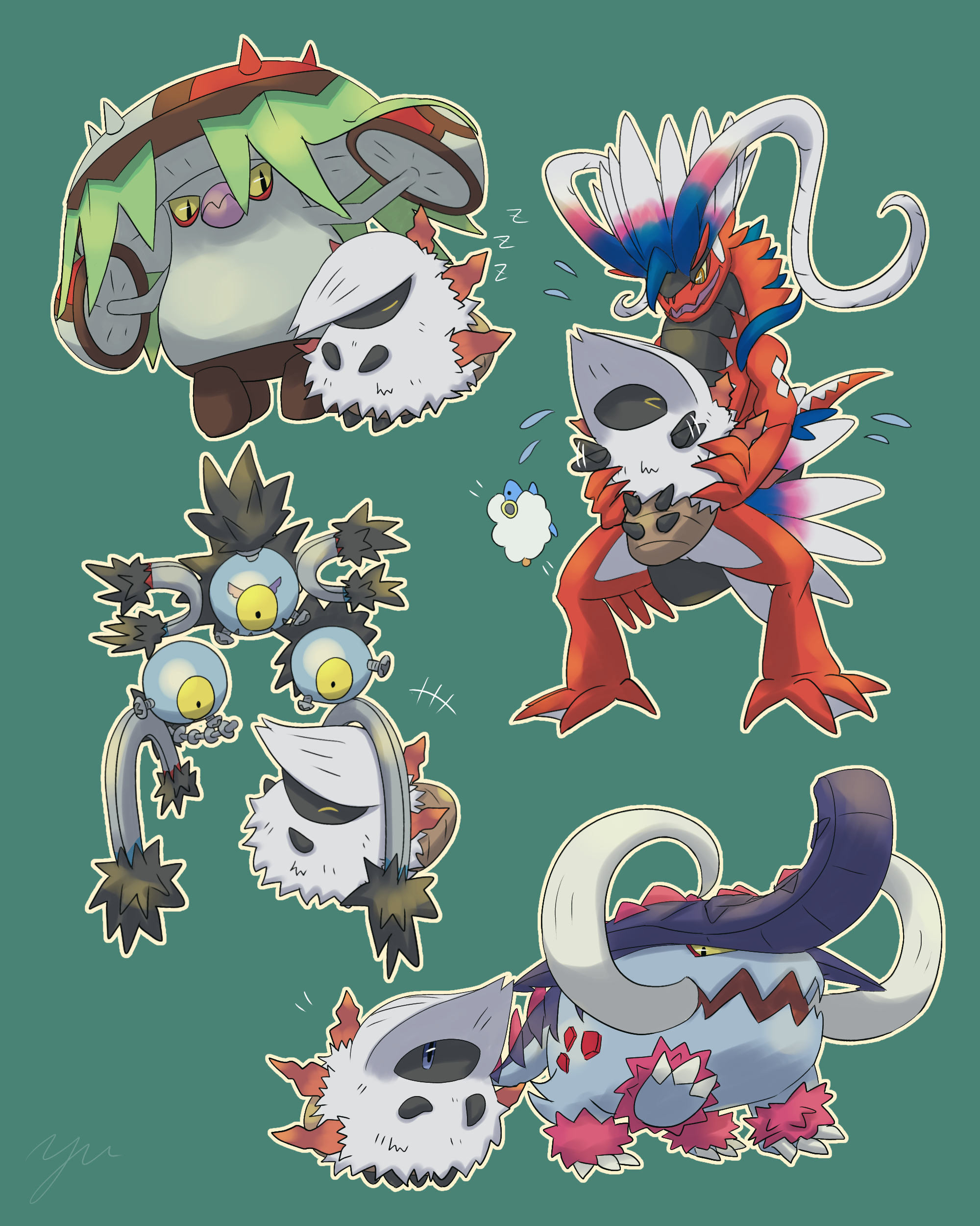 >_< +++ absurdres brute_bonnet closed_eyes closed_mouth colored_sclera commentary_request flailing flying_sweatdrops gen_2_pokemon gen_5_pokemon great_tusk green_background highres holding holding_pokemon koraidon larvesta magnet mareep motion_blur motion_lines nintendo nostrils one-eyed open_mouth orange_eyes outline pokemon pokemon_(creature) pokemon_focus sandy_shocks screw simple_background sleeping slit_pupils standing tusks v-shaped_eyes white_outline yellow_sclera yu_(pocketsun636) zzz