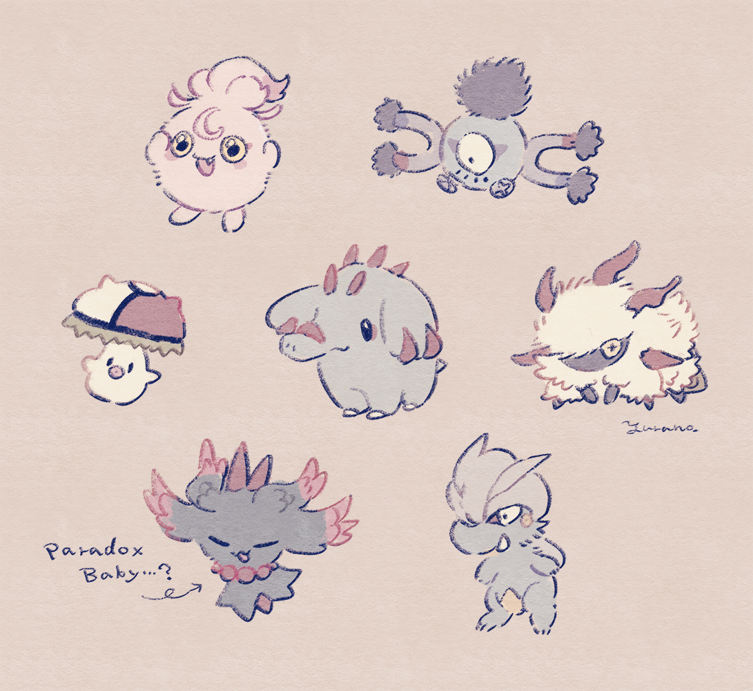 :3 arrow_(symbol) bagon brute_bonnet brute_bonnet_(cosplay) closed_eyes closed_mouth commentary_request cosplay english_text fang flutter_mane flutter_mane_(cosplay) foongus full_body gen_1_pokemon gen_2_pokemon gen_3_pokemon gen_5_pokemon great_tusk great_tusk_(cosplay) igglybuff larvesta magnemite magnet misdreavus nintendo no_humans one-eyed open_mouth phanpy pink_background pokemon pokemon_(creature) pokemon_focus roaring_moon roaring_moon_(cosplay) sandy_shocks sandy_shocks_(cosplay) scream_tail scream_tail_(cosplay) screw simple_background slither_wing slither_wing_(cosplay) smile yurano_(upao)
