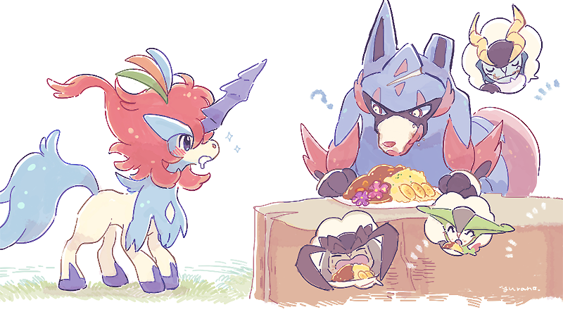 =_= ? ^_^ animal_focus banana banana_slice blush closed_eyes closed_mouth cobalion commentary_request curry curry_rice drooling food fruit gameplay_mechanics gen_5_pokemon gen_8_pokemon horns keldeo keldeo_(resolute) legendary_pokemon mouth_drool mythical_pokemon nintendo no_humans open_mouth plate pokemon pokemon_(creature) pokemon_focus pokemon_sword_and_shield rice simple_background single_horn sparkle spoken_character table terrakion virizion white_background yurano_(upao) zacian zacian_(hero)