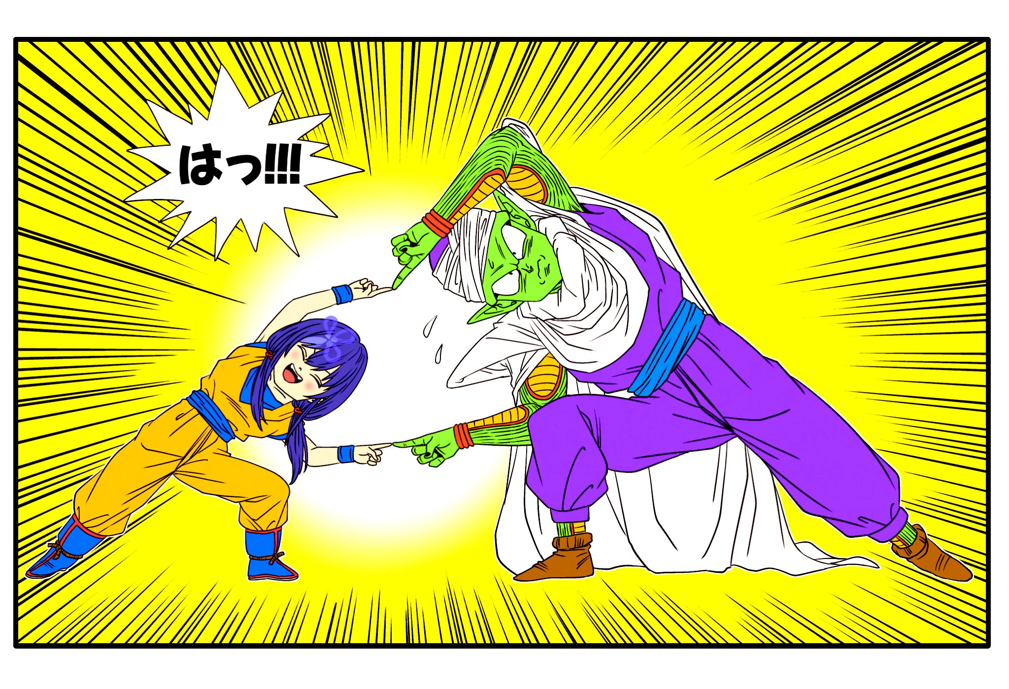 1boy 1girl blue_boots blue_hair boots brown_shoes cape closed_eyes colored_skin commentary_request cosplay dougi dragon_ball dragonball_z emphasis_lines flying_sweatdrops frown fusion_dance green_skin highres lee_(dragon_garou) low_twintails nijisanji open_mouth piccolo pointy_ears ponto_nei shoes shoulder_pads smile son_goku son_goku_(cosplay) translation_request turban twintails virtual_youtuber white_cape wristband