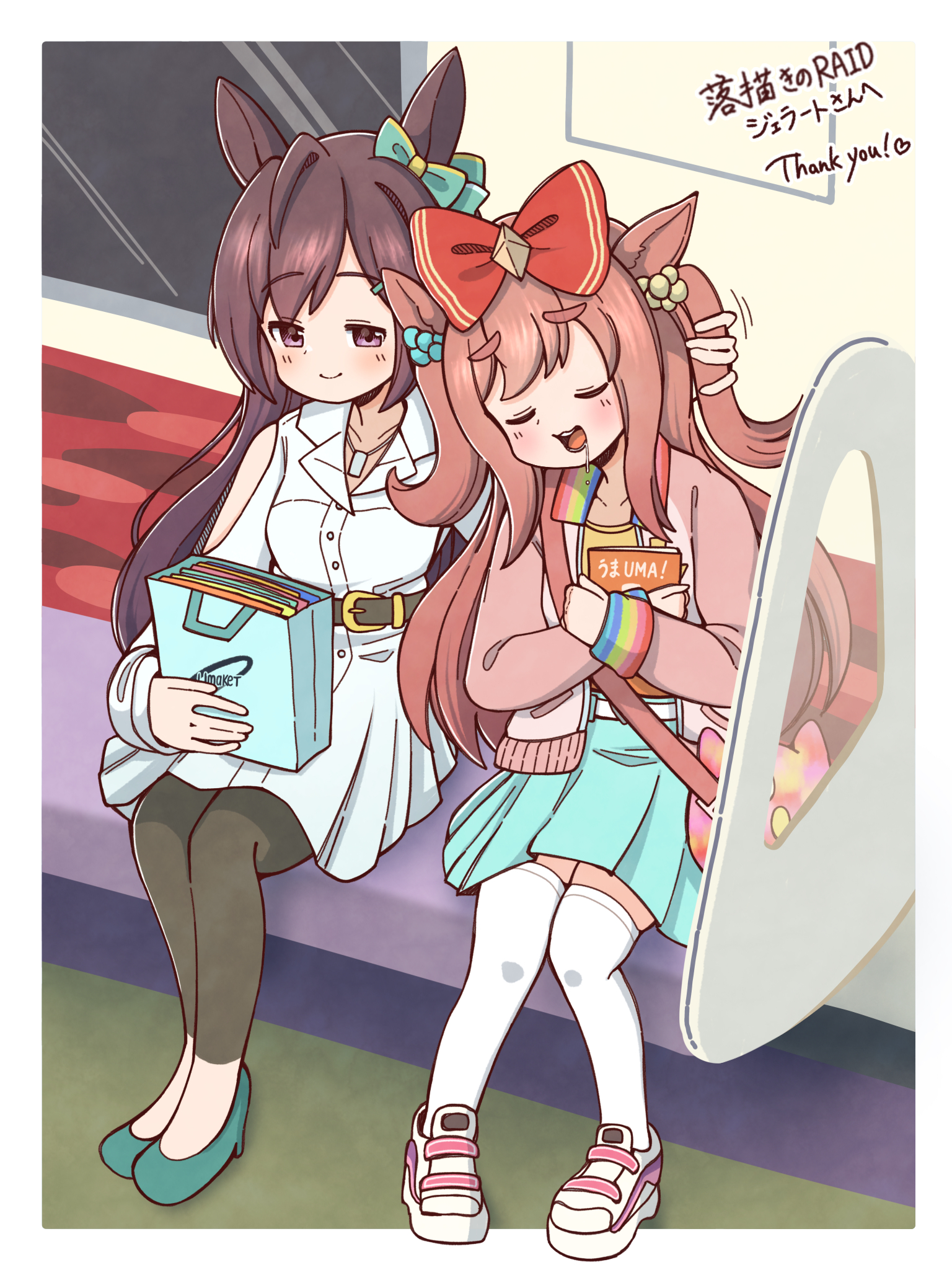 2girls :d agnes_digital_(casual)_(umamusume) agnes_digital_(umamusume) animal_ears bag belt belt_buckle black_leggings blue_bow blue_shoes blue_skirt blush bow brown_belt brown_hair buckle closed_eyes closed_mouth clothing_cutout commentary_request dress ear_bow hair_bow hair_ornament hairclip hand_in_another's_hair highres horse_ears horse_girl horse_tail hugging_object jacket leggings long_hair long_sleeves mejiro_dober_(casual)_(umamusume) mejiro_dober_(umamusume) multiple_girls open_clothes open_jacket open_mouth pink_jacket pleated_dress pleated_skirt purple_eyes rakugakiraid red_bow shoes shoulder_bag shoulder_cutout sitting skirt smile tail thick_eyebrows thighhighs train_interior two_side_up umamusume very_long_hair white_dress white_shoes white_thighhighs