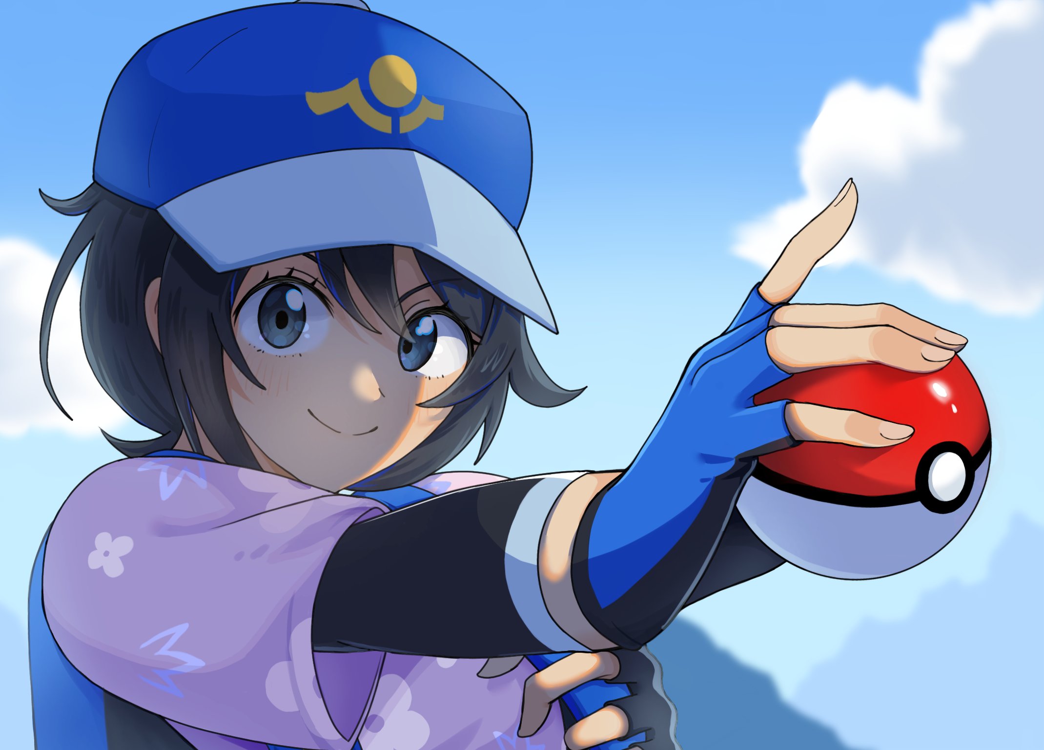 1girl adjusting_strap backpack bag baseball_cap black_bodysuit black_eyes black_gloves black_hair blue_bag blue_gloves blue_hat blue_sky blurry blurry_background blush bob_cut bodysuit bodysuit_under_clothes close-up closed_mouth cloud commentary cumulonimbus_cloud depth_of_field diving_suit eyelashes female_protagonist_(pokemon_ww) fingerless_gloves floral_print floral_print_shirt foreshortening gloves hair_between_eyes hat highres holding holding_poke_ball holding_strap layered_sleeves light_blush long_sleeves looking_at_viewer mikan_ame9 mountainous_horizon multicolored_gloves nintendo pink_shirt poke_ball poke_ball_(basic) pokemon pokemon_winds_and_waves portrait shirt short_hair short_sleeves sky smile solo two-tone_gloves wetsuit