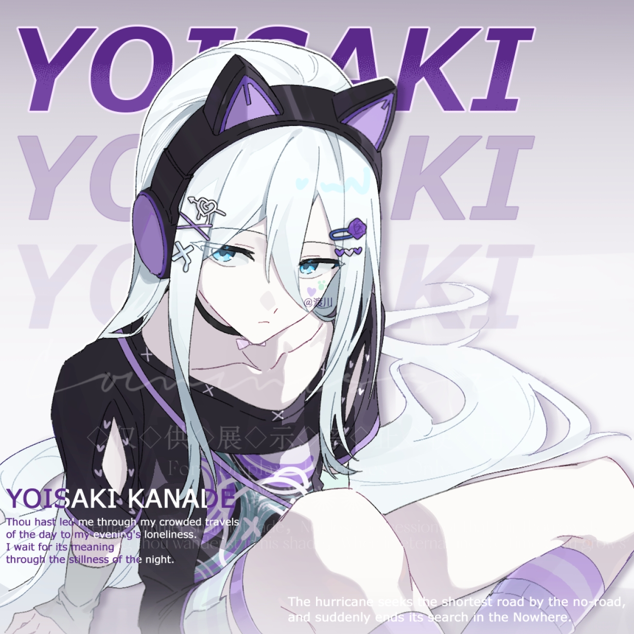 1girl :< animal_ear_headphones animal_ears arm_support arm_warmers black_choker black_shirt blue_eyes cat_ear_headphones cat_ears character_name chinese_commentary choker closed_mouth clothing_cutout collarbone commentary_request dove_521 english_text facial_mark fake_animal_ears flat_chest grey_skirt hair_between_eyes hair_ornament hair_spread_out hairclip headphones heart heart_facial_mark heart_hair_ornament highres long_bangs long_hair long_sidelocks looking_at_viewer mark_under_eye negai_wa_itsuka_asa_wo_koete_(project_sekai) official_alternate_costume paw_facial_mark pleated_skirt project_sekai shirt short_sleeves shoulder_cutout sidelocks sitting skirt solo straight_hair very_long_hair watermark white_hair x_hair_ornament yami_kawaii yoisaki_kanade