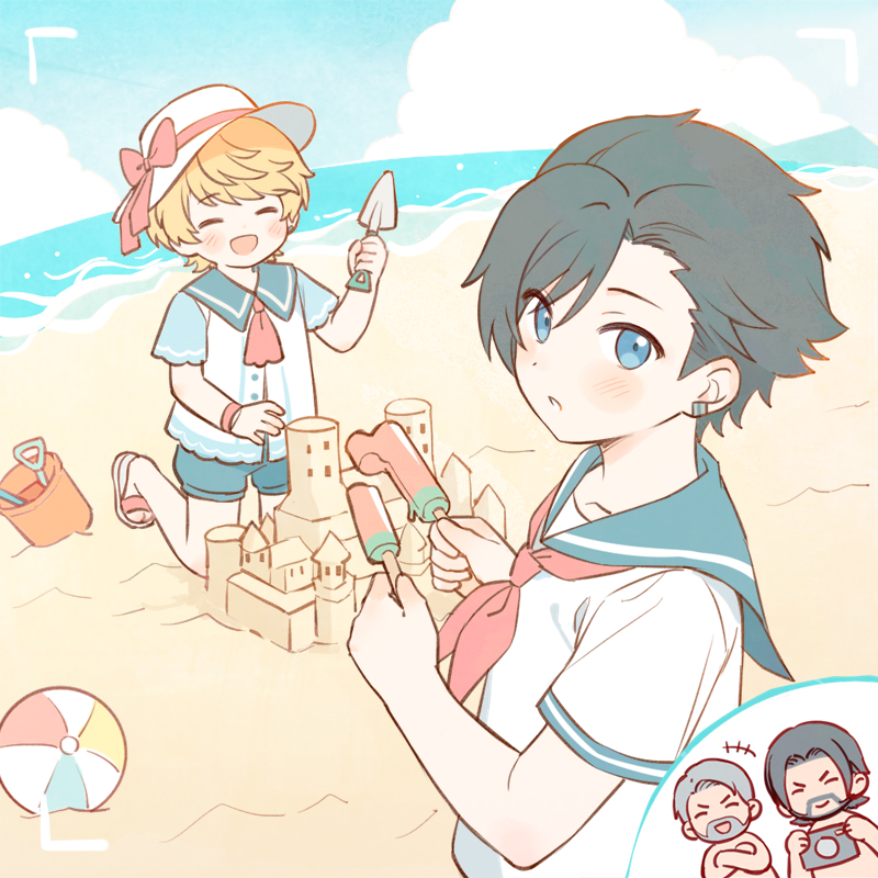 ball beach beachball beard black_hair blonde_hair blue_eyes blue_sailor_collar blue_shorts blush brothers bucket byron_rosfield camera chibi chibi_inset child clive_rosfield closed_eyes commentary crossed_arms earrings elwin_rosfield facial_hair father_and_child father_and_son final_fantasy final_fantasy_xvi food furrowed_brow grey_hair hat holding holding_camera holding_food holding_popsicle holding_trowel jewelry joshua_rosfield laughing miumiu76706 neckerchief ocean open_mouth parent_and_child parted_lips popsicle red_neckerchief sailor_collar sand_castle sand_sculpture shirt shorts siblings smile topless_male trowel uncle_and_nephew untranslatable_commentary viewfinder white_hat white_shirt