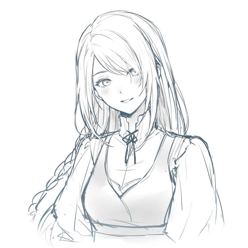 1girl braid breasts commentary final_fantasy final_fantasy_xvi greyscale hair_between_eyes jill_warrick juliet_sleeves light_blush light_smile long_hair long_sleeves looking_at_viewer medium_breasts miumiu76706 monochrome neck_ribbon parted_bangs parted_lips puffy_sleeves ribbon side_braid sketch solo untranslatable_commentary upper_body white_background