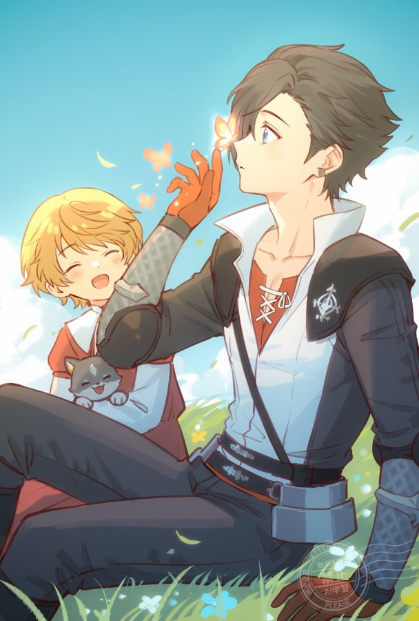 2boys animal baby_animal black_hair black_pants blonde_hair blue_eyes blush brothers bug butterfly butterfly_on_nose child clive_rosfield closed_eyes commentary dog final_fantasy final_fantasy_xvi gloves grass hair_between_eyes holding holding_animal holding_dog insect joshua_rosfield laughing male_focus miumiu76706 multiple_boys open_mouth outdoors pants popped_collar puppy red_gloves red_tunic shirt shoulder_pads siblings sitting smile torgal_(ff16) tunic untranslatable_commentary white_shirt wolf