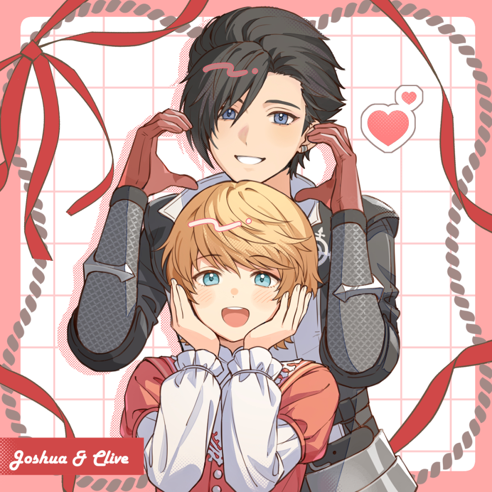 2boys aqua_eyes black_hair black_jacket blonde_hair blue_eyes blush border brothers character_name child clive_rosfield commentary final_fantasy final_fantasy_xvi gloves grid_background hands_on_own_cheeks hands_on_own_face jacket joshua_rosfield male_focus miumiu76706 multiple_boys open_mouth parted_lips pink_border red_gloves red_tunic shirt siblings smile teeth tunic untranslatable_commentary upper_body white_shirt