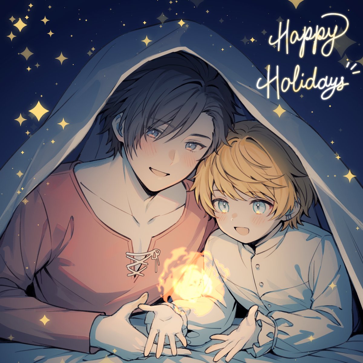 2boys blue_eyes blush brothers child clive_rosfield commentary earrings final_fantasy final_fantasy_xvi fire hair_between_eyes happy_holidays highres jewelry joshua_rosfield long_sleeves male_focus miumiu76706 multiple_boys open_mouth puffy_long_sleeves puffy_sleeves red_shirt shirt short_hair siblings smile sparkle under_covers untranslatable_commentary white_shirt