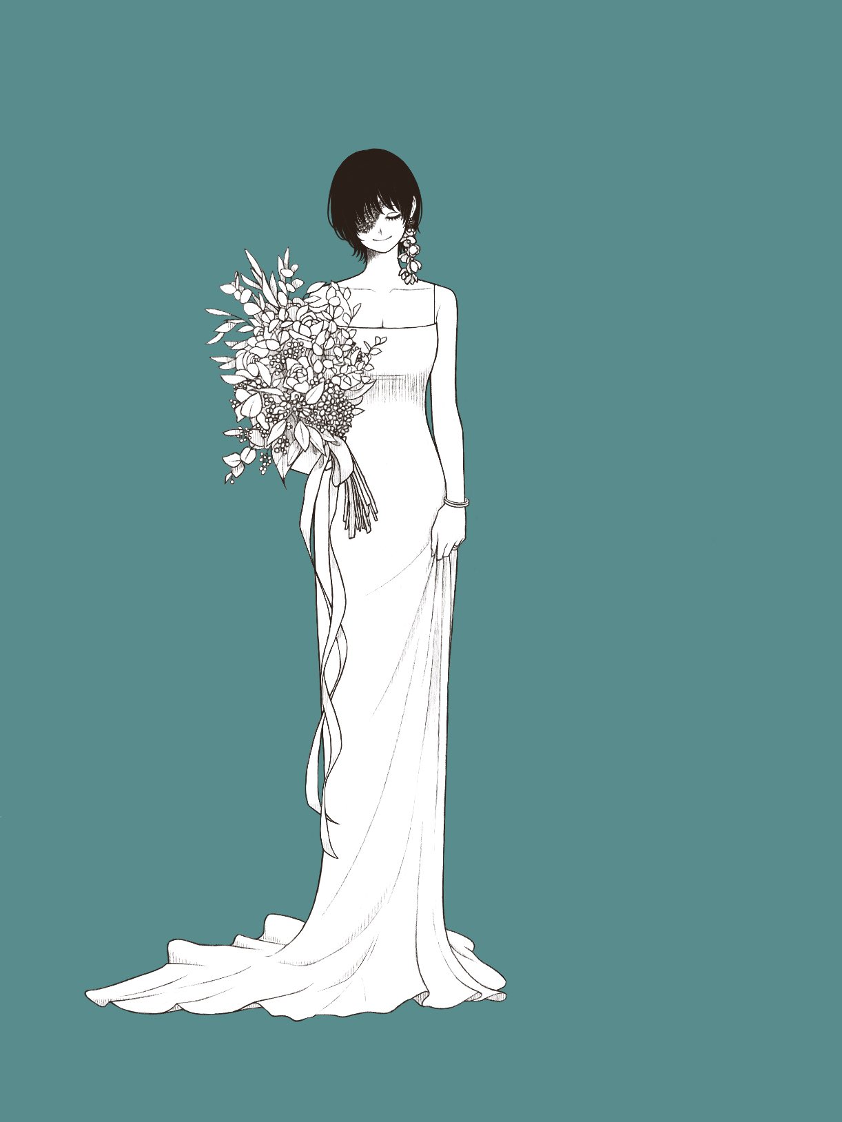 1girl bouquet bracelet breasts chainsaw_man cleavage closed_eyes closed_mouth commentary_request dress earrings eyepatch flower full_body green_background highres himeno_(chainsaw_man) holding holding_bouquet jewelry kgsp_22 long_dress medium_breasts monochrome short_hair single_earring sleeveless sleeveless_dress smile solo standing white_dress