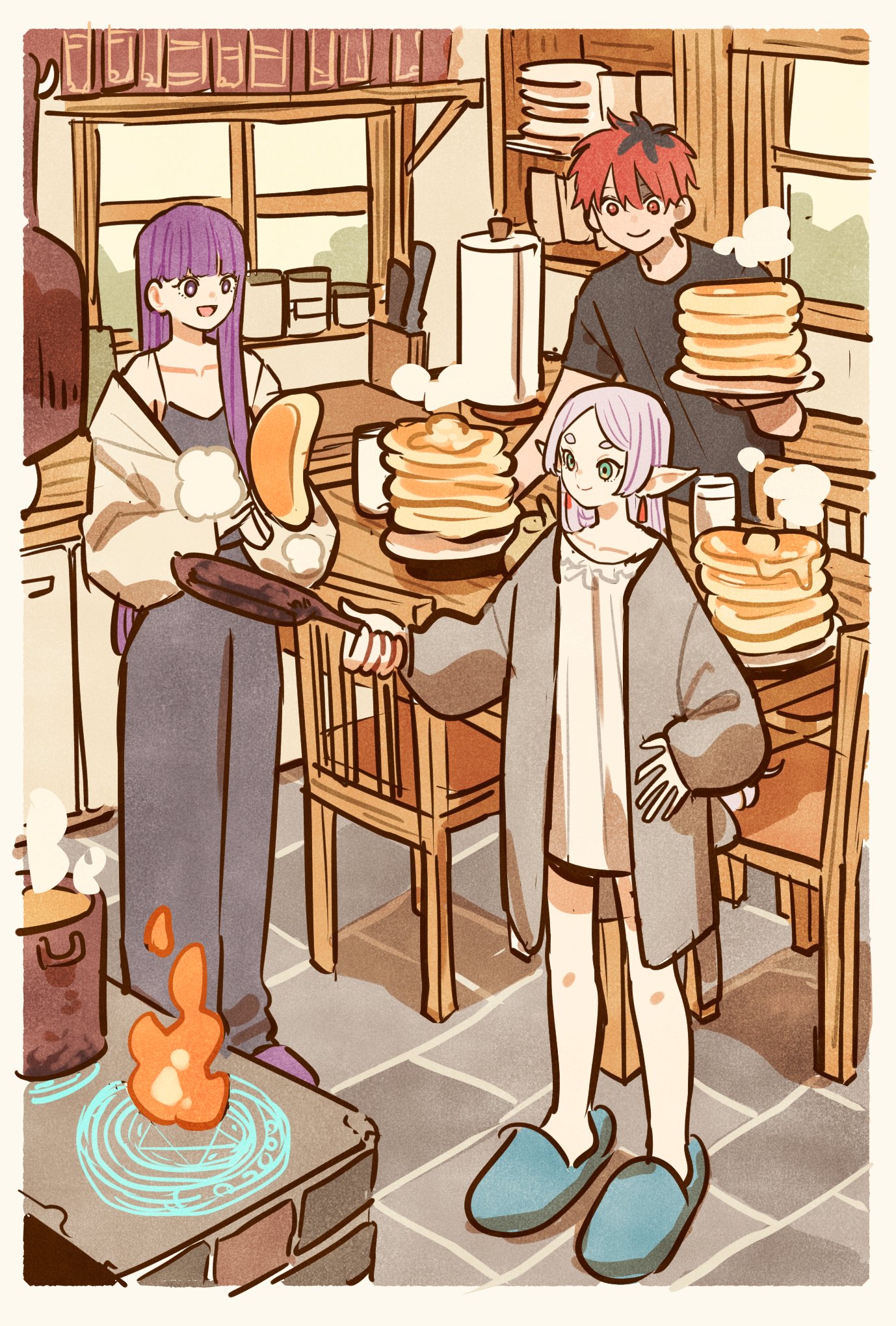 1boy 2girls black_camisole black_pantyhose black_roots black_shirt border camisole closed_mouth commentary_request dress earrings elf fern fern_(sousou_no_frieren) fire flipping_food food frieren frying_pan green_eyes grey_hair grey_jacket hair_between_eyes highres holding holding_frying_pan indoors jacket jewelry kitchen looking_at_another multiple_girls open_mouth pancake pancake_stack pantyhose paper_towel_holder pointy_ears purple_eyes purple_hair red_eyes red_hair shirt short_dress short_hair slippers smile sousou_no_frieren stark_(sousou_no_frieren) steaming_food t-shirt takeuchi_ryousuke thick_eyebrows white_border white_dress white_jacket window
